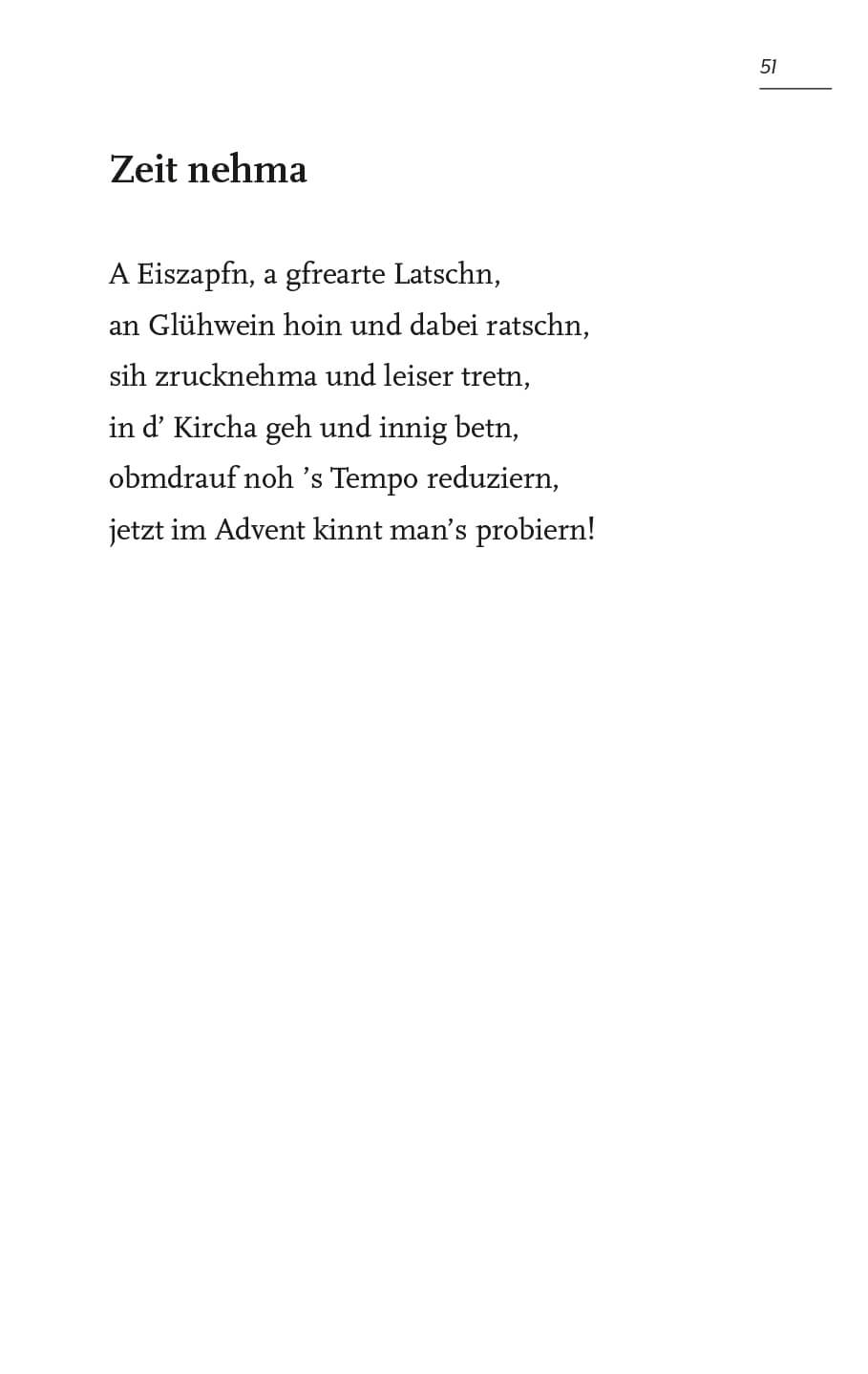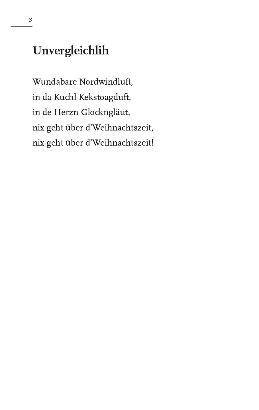 Wenn die Tage kürzer werden und die Menschen mit allen Sinnen dem Weihnachtsfest entgegenfiebern, läuft Monika Krautgartner jedes Jahr zur Höchstform auf. In schönster oberösterreichischer Mundart stimmen ihre Texte auf Weihnachten ein. Sie lässt ihre Leserinnen und Leser einen Blick auf ihre glitzernde, fröhliche Weihnachtswelt werfen.