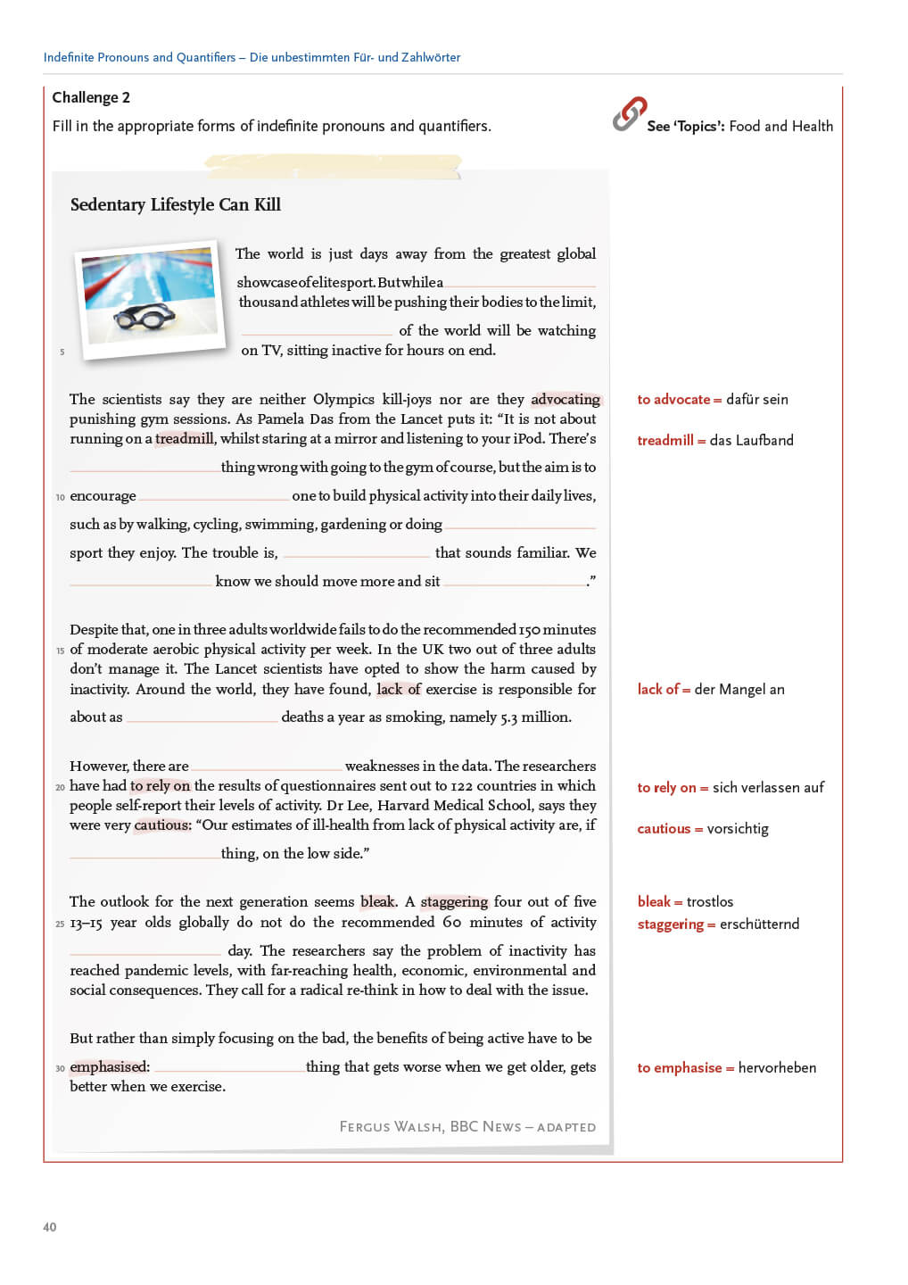 Die übersichtlichen, nach grammatischen Schwerpunkten gegliederten Kapitel sind alphabetisch geordnet. Jedes Kapitel enthält zahlreiche Übungssätze sowie mindestens eine Übung „Grammar in Context“, für die ein Text auf dem Niveau B2 herangezogen wird. Zusätzlich bietet der Band Erklärungen und Regeln in übersichtlicher Form zum Nachschlagen an.