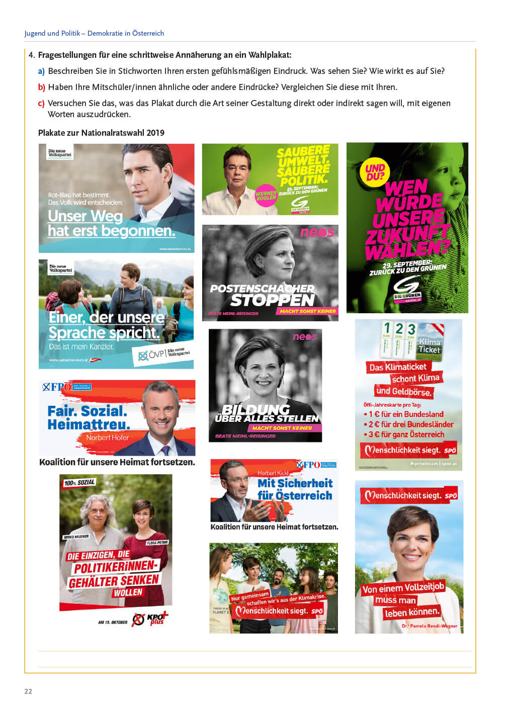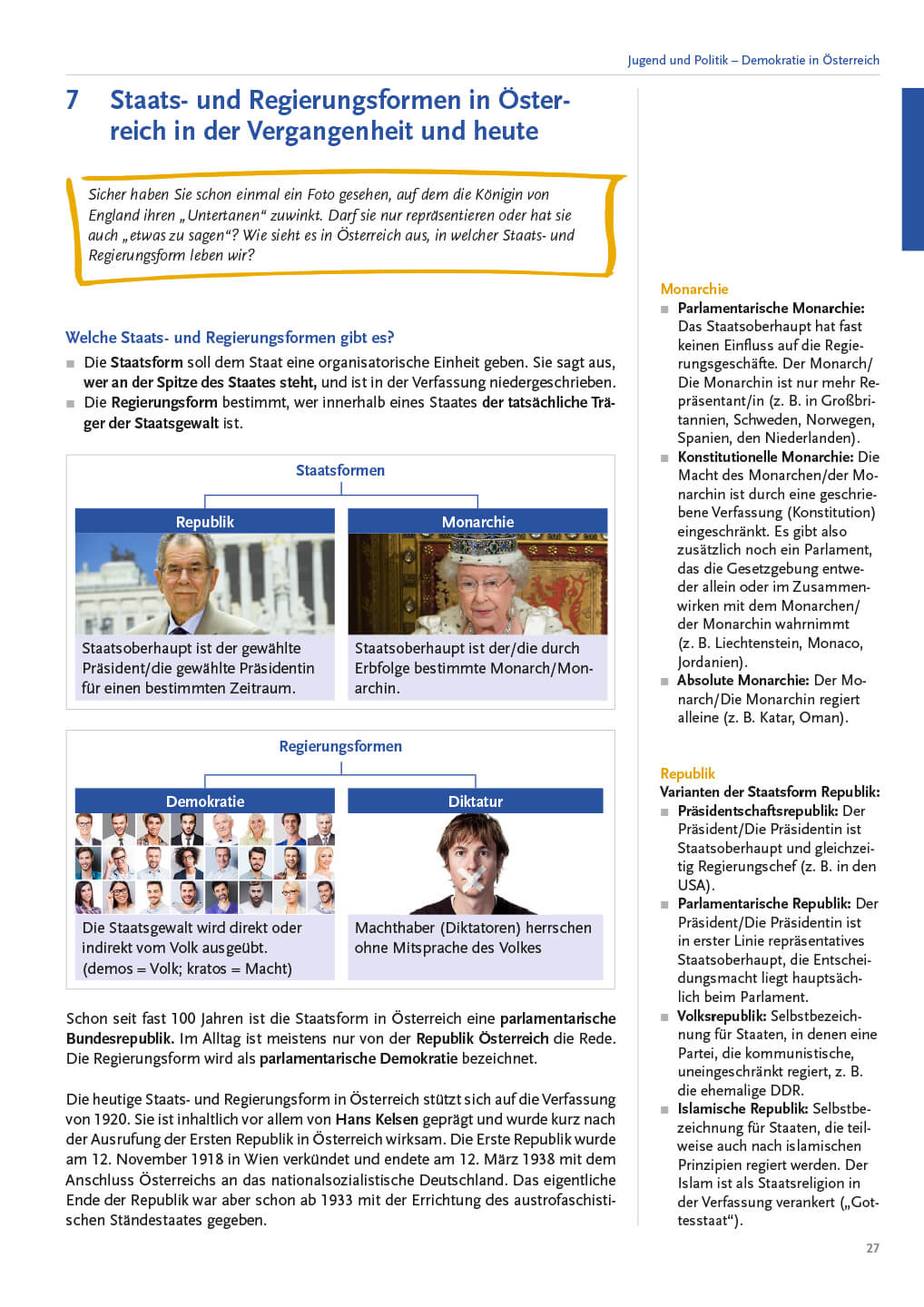 - Jugend und Politik . Demokratie in Österreich (1 Politik – geht mich das was an? 2 Politikverdrossenheit? Macht es Sinn, sich zu engagieren? 3 Demokratisches Bewusstsein und politische Mitsprache 4 Schülermitverwaltung – Schuldemokratie 5 Demokratie im Staat 6 Ein langer Weg – die Entwicklung des Wahlrechts 7 Staats- und Regierungsformen in Österreich in der Vergangenheit und heute 8 Parlamentarisches System – Präsidialsystem 9 Die österreichische Bundesverfassung 10 Das parlamentarische System 11 Politische Parteien 12 Interessenvertretungen 13 Sozialpartnerschaft 14 Die demokratische Grundordnung der Republik Österreich 15 Gebietskörperschaften