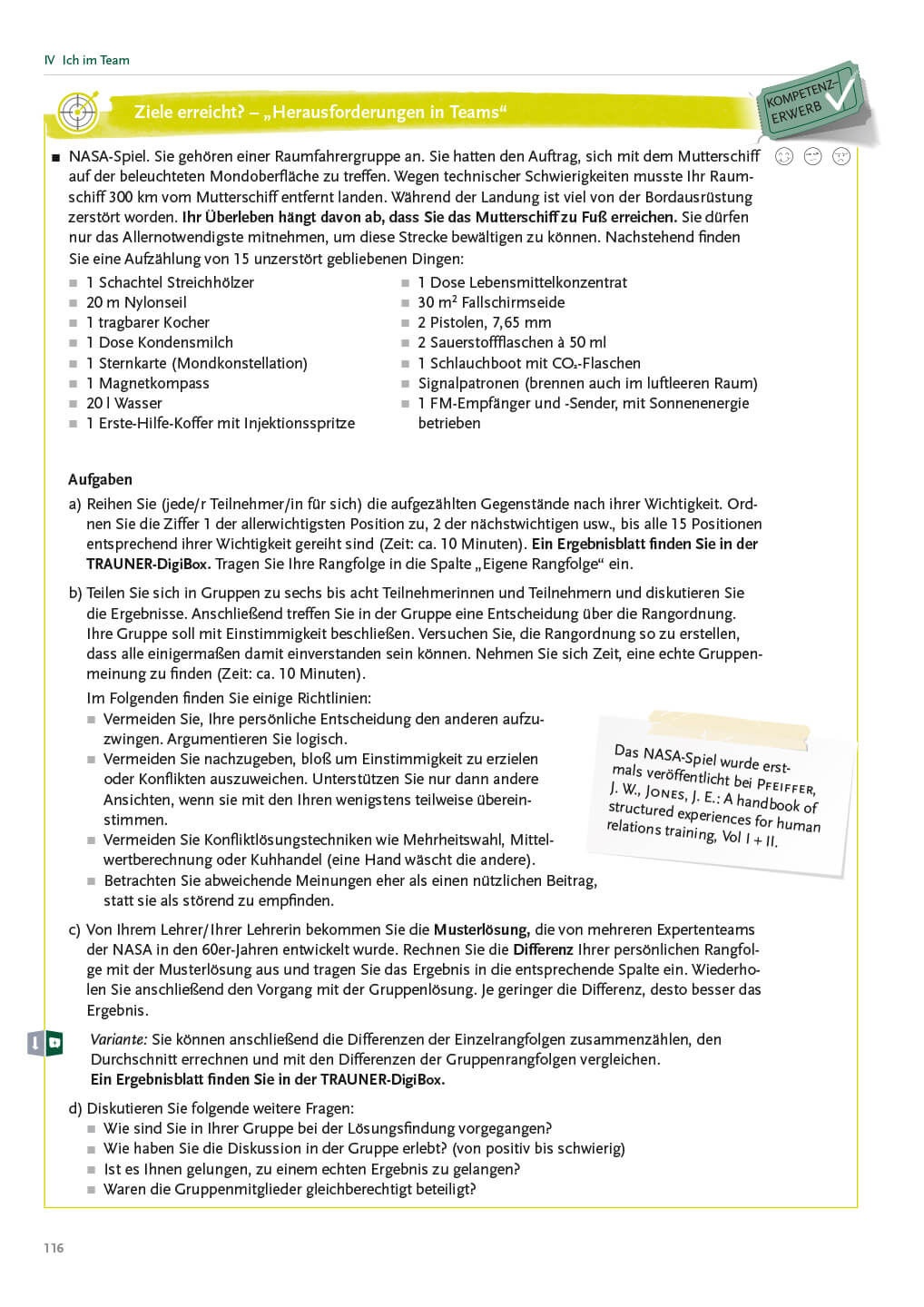 Team-, Konflikt- und Kommunikationsfähigkeit, sind im Berufsleben als Schlüsselqualifikationen heutzutage mehr gefordert denn je. Dieses Buch bietet den Schülerinnen und Schülern Methoden und Techniken für den Erwerb dieser sozialen und personalen Kompetenzen.