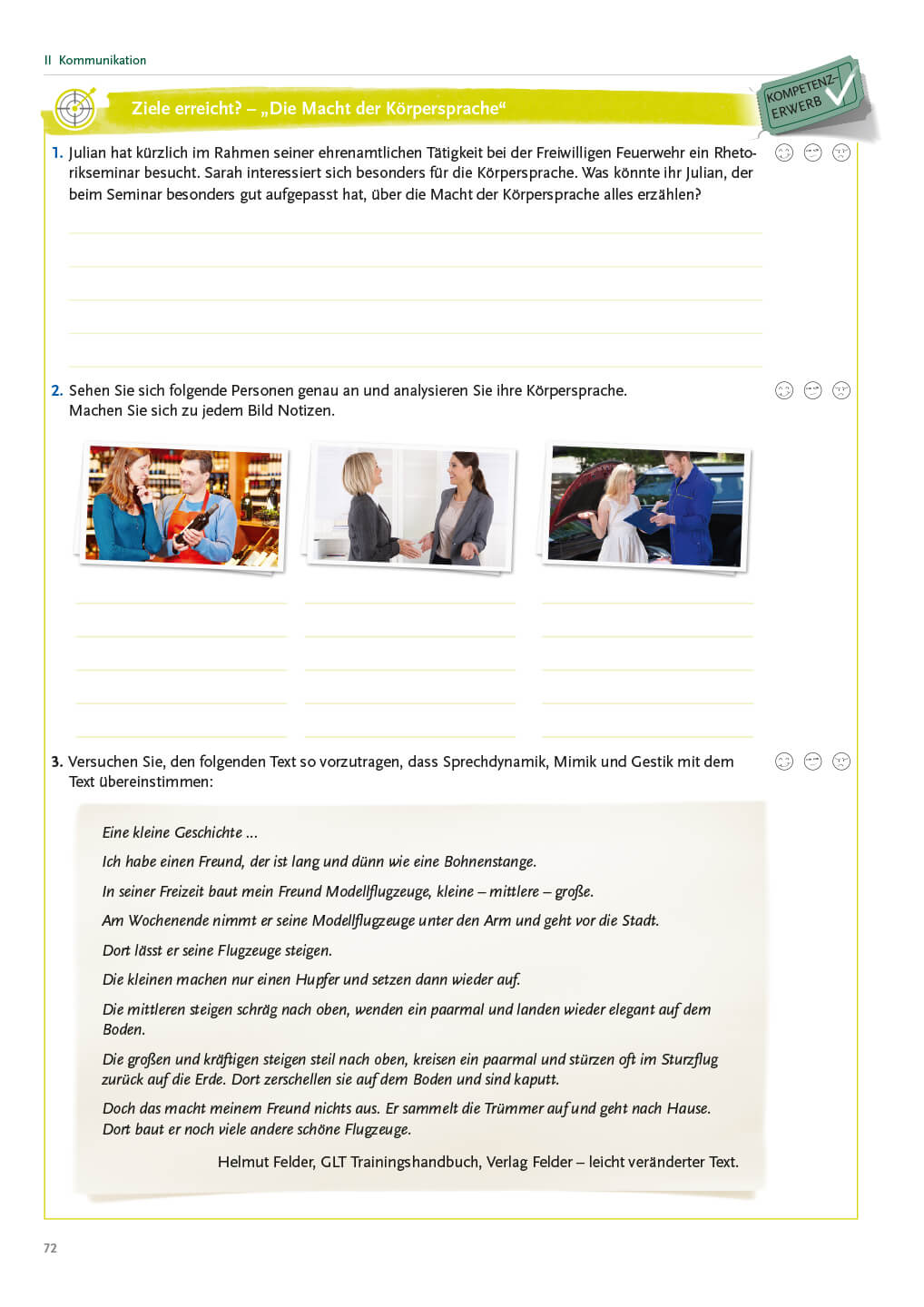 Zahlreiche bewährte Aufgabenstellungen von anerkannten Kommunikationstrainern helfen außerdem, Redehemmungen abzubauen und sprachliche Ausdrucksformen sowie die Körpersprache optimal einzusetzen.