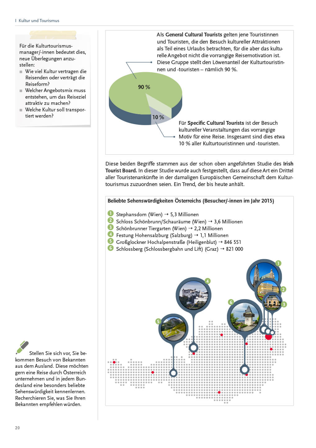 Kultur hat viele Facetten. Nicht nur Theater oder Museen, auch Bälle, Kunsthandwerksmärkte u. v. m. sind kulturelle Erscheinungsformen. Das Buch will die Schülerinnen und Schüler für die Vielfalt kultureller Angebote sensibilisieren und zeigen, wie bedeutungsvoll touristische Sehenswürdigkeiten, Messen, Events und andere kulturelle Veranstaltungen für Gastronomie, Hotellerie und Tourismus sind.