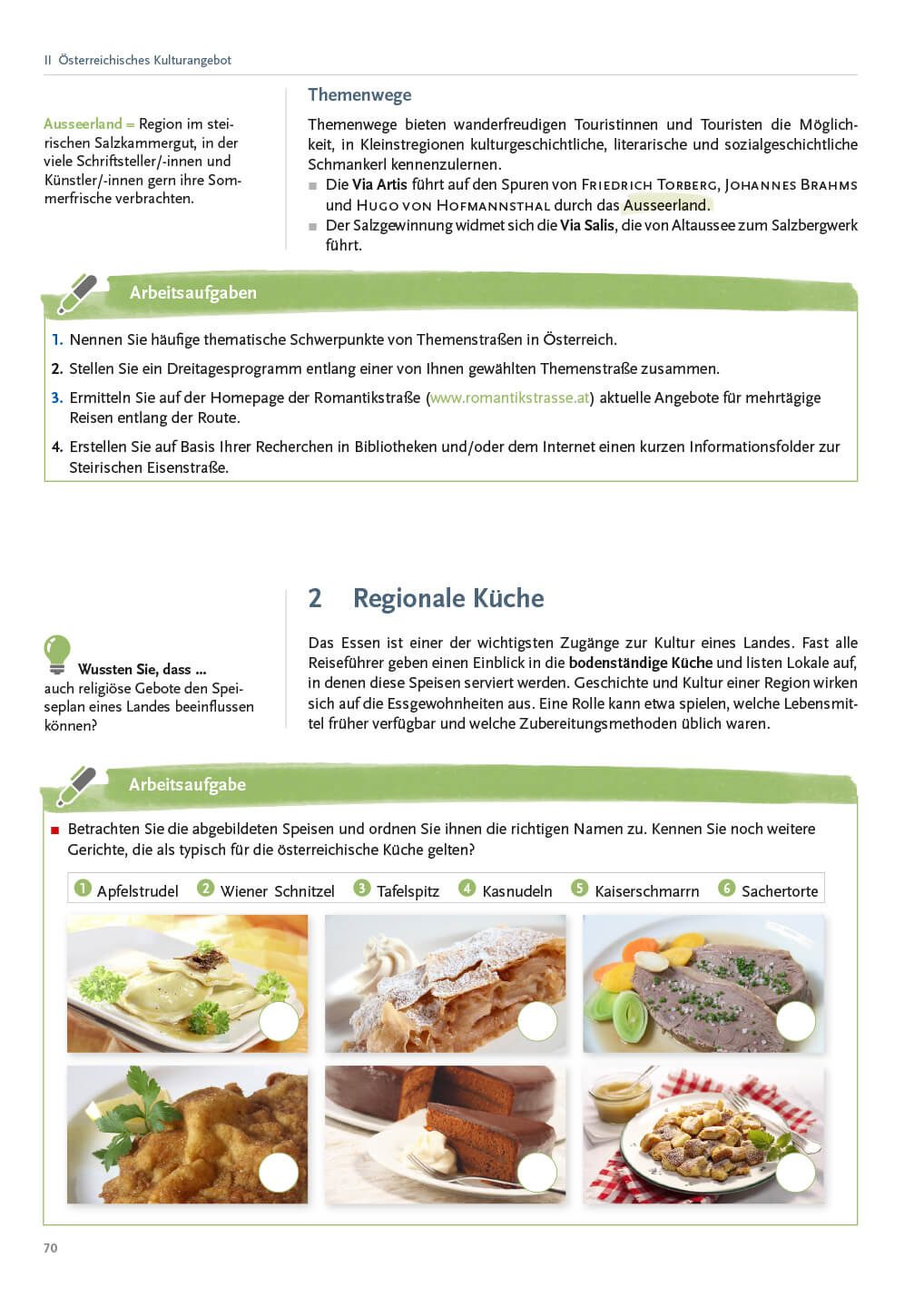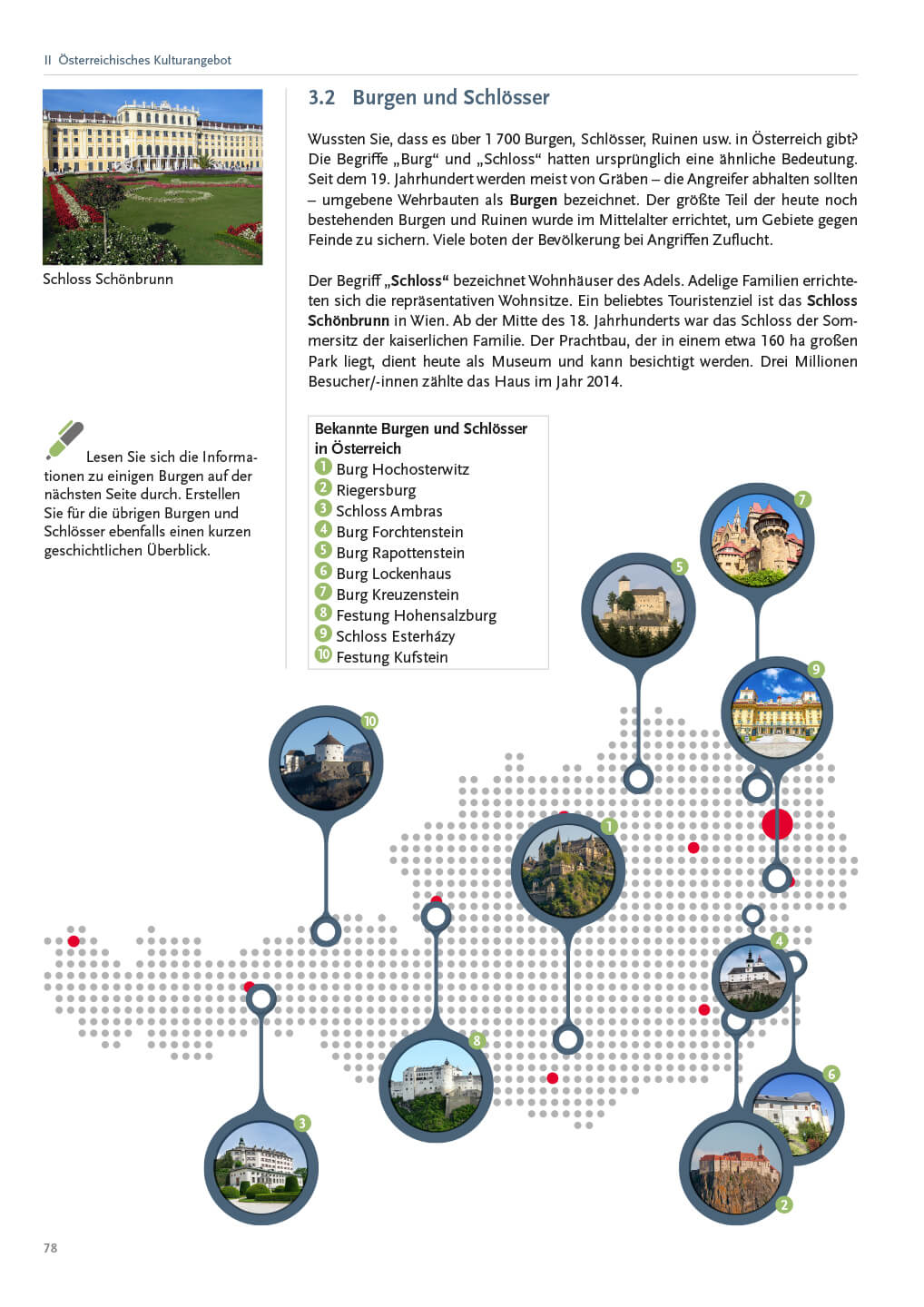 Viele Beispiele aus ganz Österreich zeigen praxisnah, wie vielfältig die kulturellen Angebote sein können. In zahlreichen Aufgabenstellungen sind die Schülerinnen und Schüler aufgefordert, sich aktiv mit den kulturtouristischen Angeboten in ihrer Region, ihrem Bundesland etc. auseinanderzusetzen.
