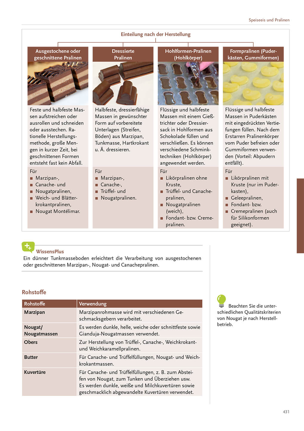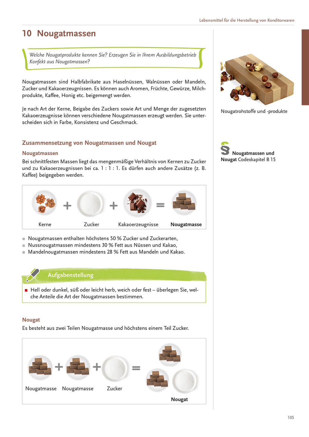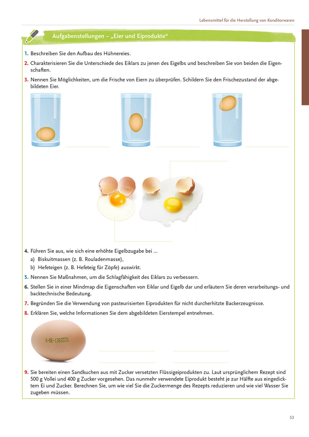 - Fachkunde: Grundlagen, Teige, Massen, Füllcremen, Füllungen, Glasuren und Überzugsmassen, Teegebäck, Konditoreierzeugnisse und Backerzeugnisse für besondere Ernährungsbedürfnisse, Produktverarbeitung, Speiseeis und Pralinen, Patisserie, Snacks und Getränke, Verkauf und Präsentation.