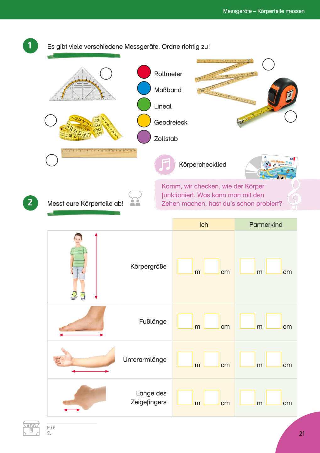 Ausgehend vom eigenen Körper erforschen die Schüler/innen Größen wie Meter, Kilogramm, Stunde und Euro.