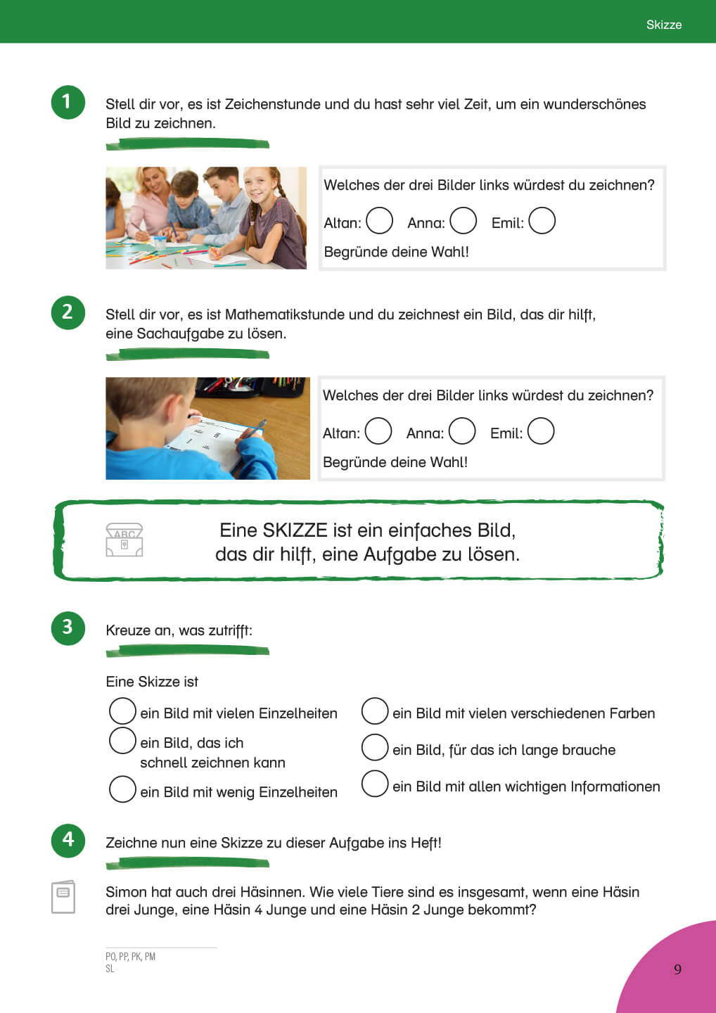 Alltagssituationen werden zu mathematischen Geschichten. Skizzen helfen beim Lösen der Aufgaben.