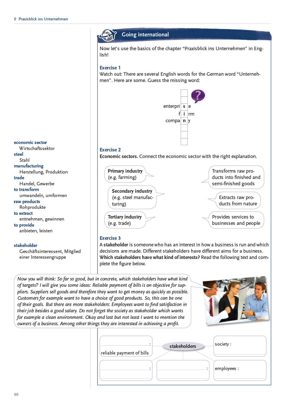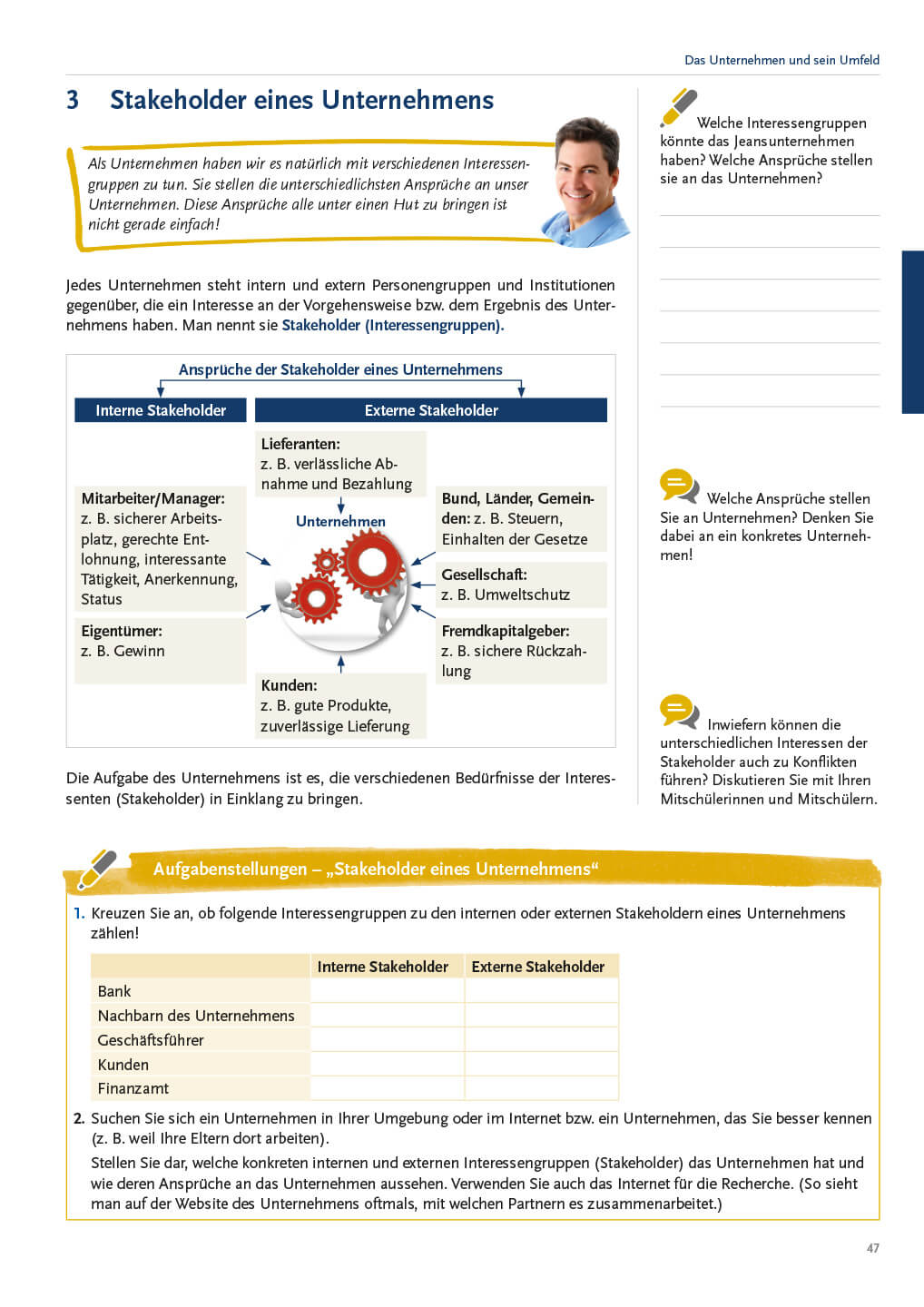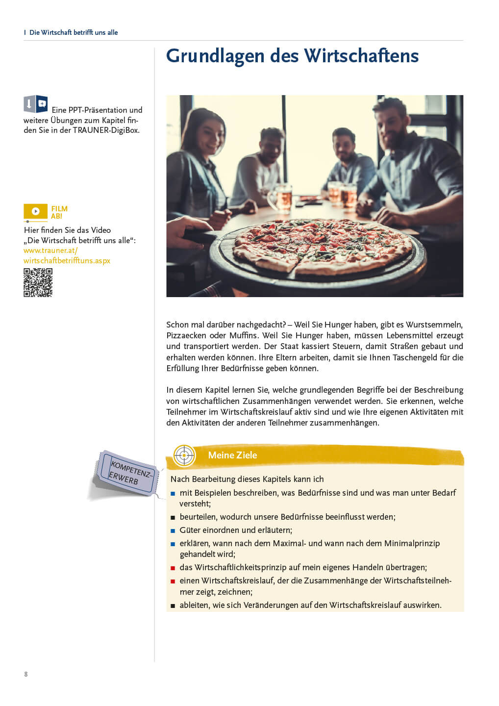 Aktiv werden die Schülerinnen und Schüler auf ihre Rolle als Arbeitnehmer/in bzw. Unternehmer/in und als Konsument/in vorbereitet. Neben prägnanten Sachtexten und vielen Übersichten, die dem Unterricht Struktur geben und systematisches Lernen ermöglichen, werden die Schülerinnen und Schüler mit Echtsituationen konfrontiert. Dabei werden sie sich einzeln und im Team an Themen- und Aufgabenstellungen erproben. Schrittweise entwickeln die Lernenden Kompetenzen, die sie befähigen, betriebswirtschaftliche Probleme zu erkennen, zu analysieren und zu lösen, nicht nur in der fiktiven Betriebswelt der Schule, sondern auch in der konkreten betrieblichen Wirklichkeit.