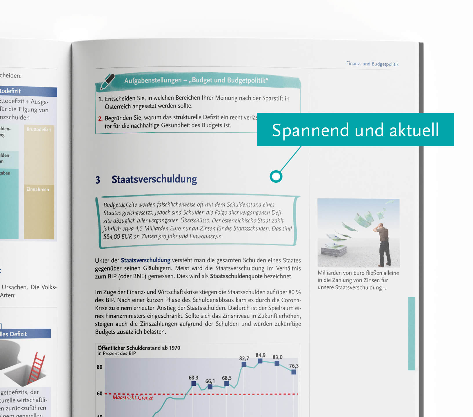 Spannende Beispiele aus der Realwirtschaft, verständliche Sachtexte und viele Übersichten veranschaulichen die Inhalte. Die Schüler/innen entwickeln schrittweise Kompetenzen, um volkswirtschaftliche Probleme erkennen, analysieren und lösen zu können.