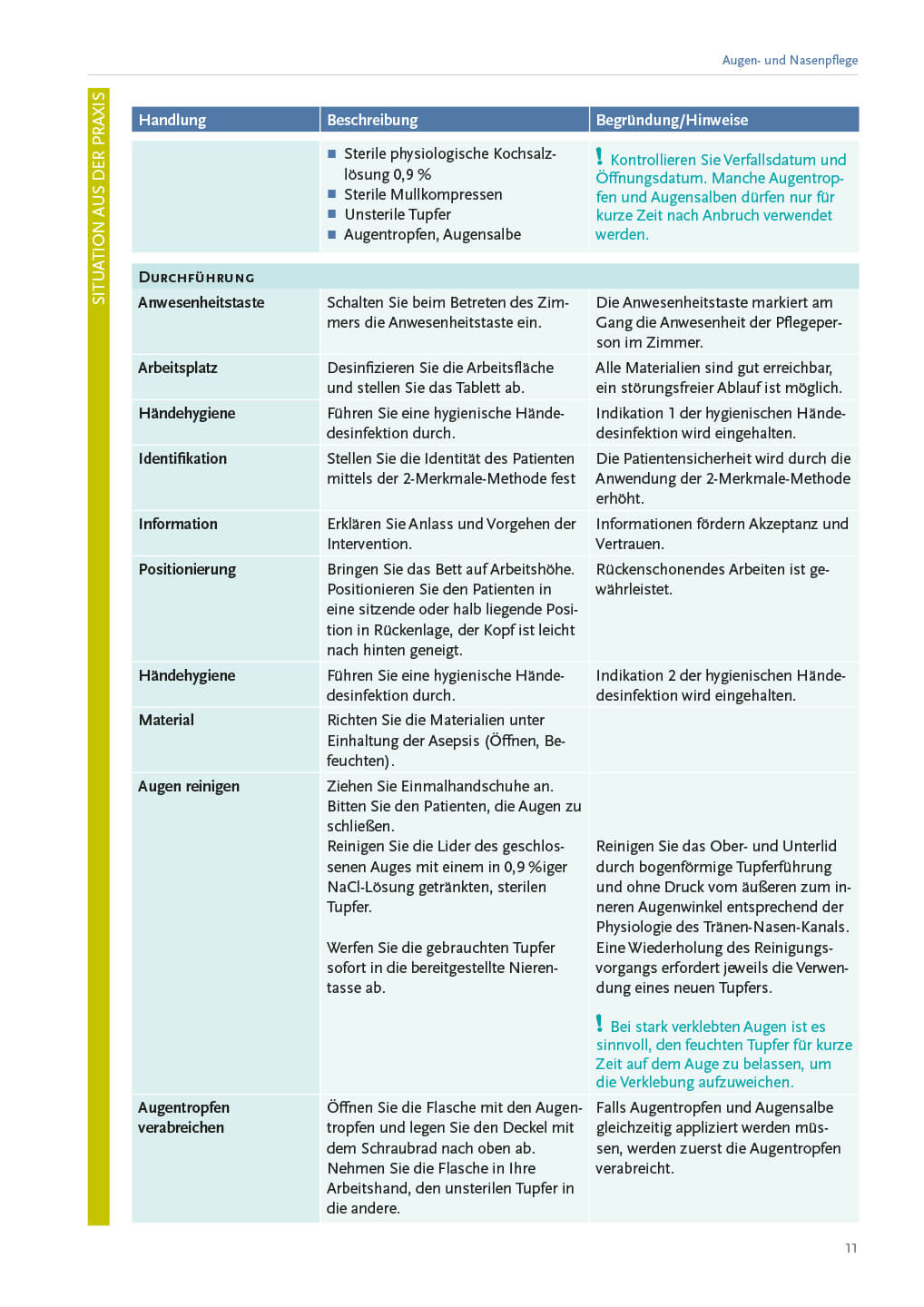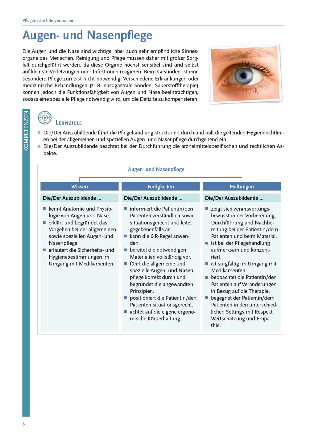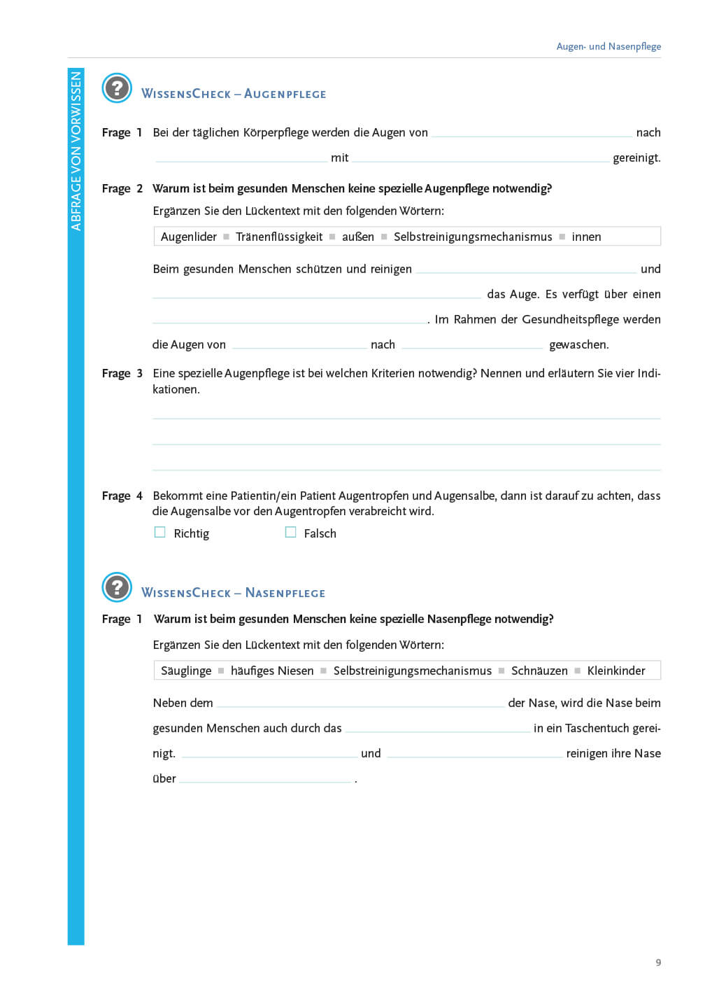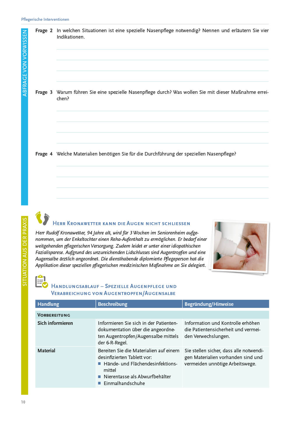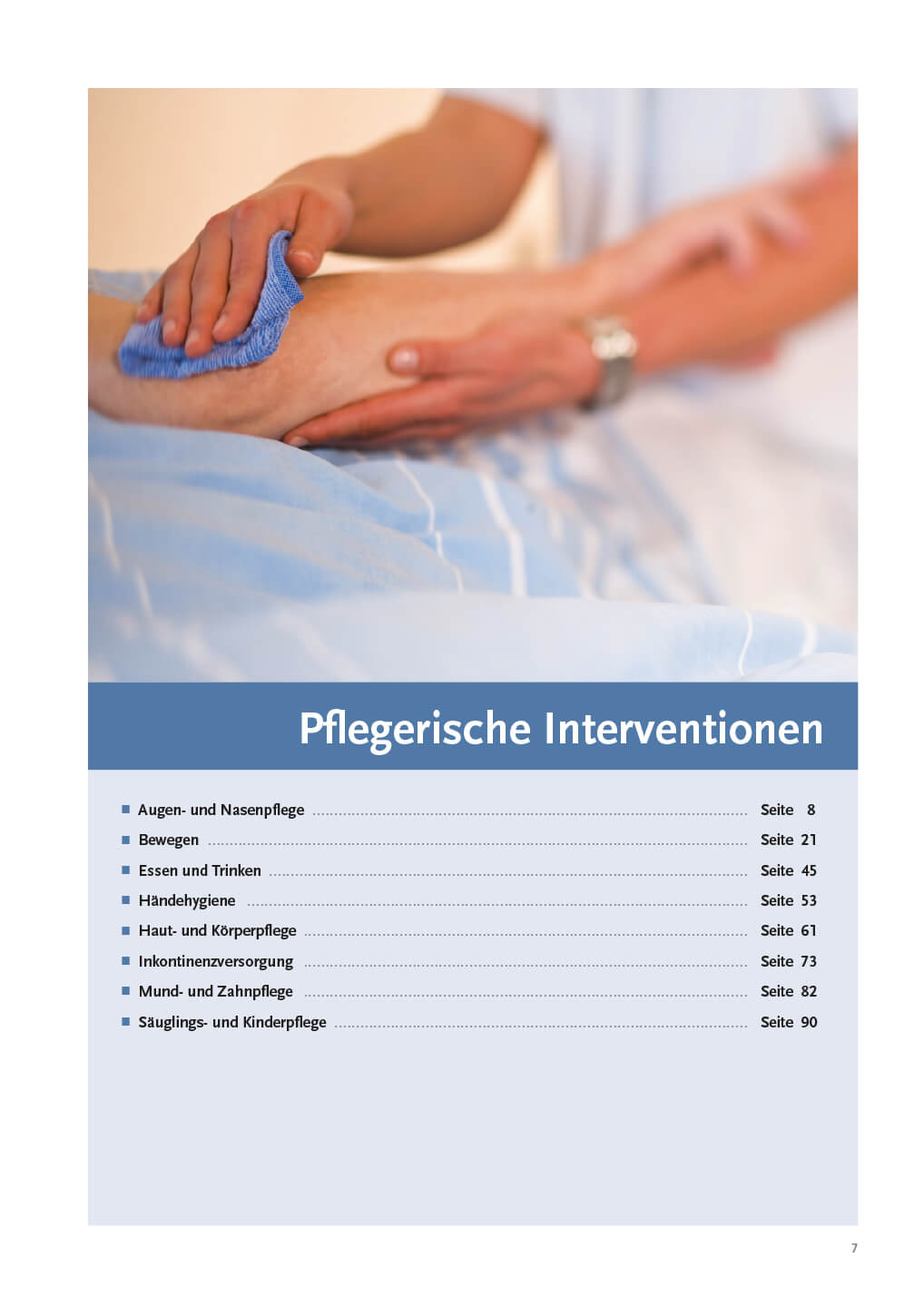 Jedes der 21 Kapitel gliedert sich, passend zur pflegerischen, diagnostischen oder therapeutischen Intervention, in Vorwissensabfragen, Fallbeispiele, Handlungschecklisten sowie Vertiefungs- und Transferaufgaben.