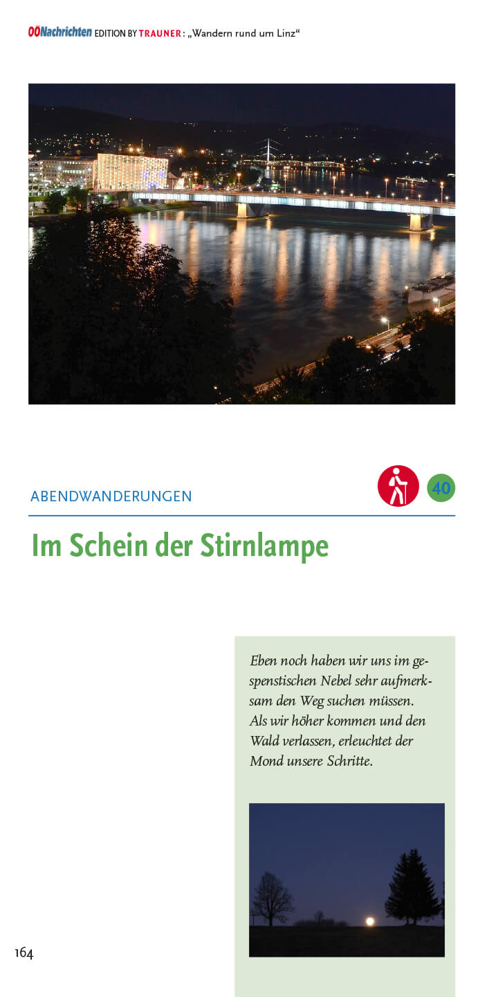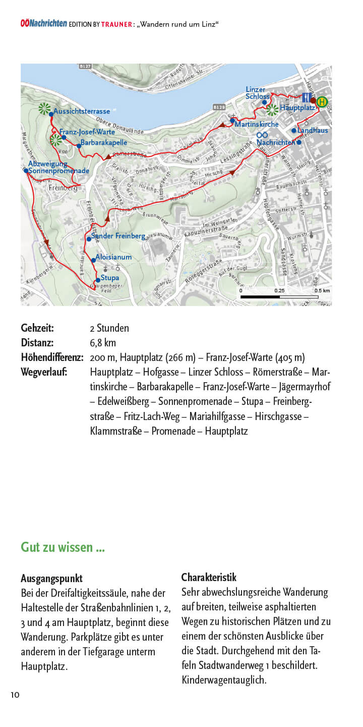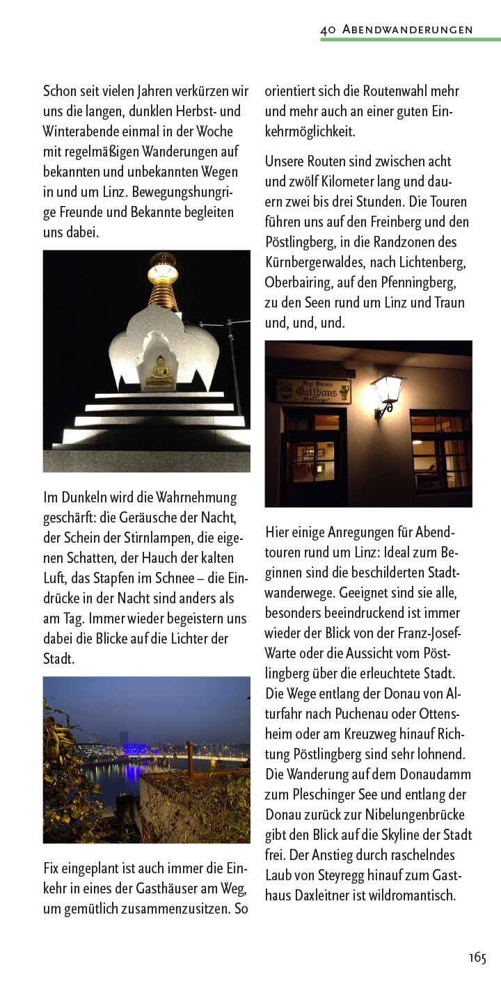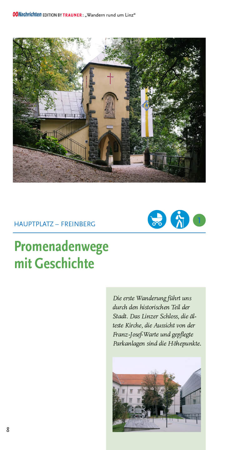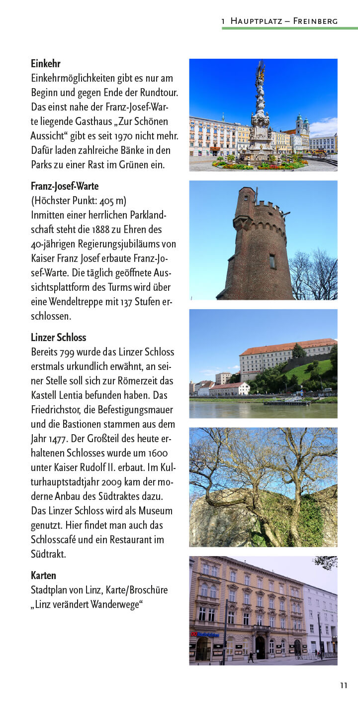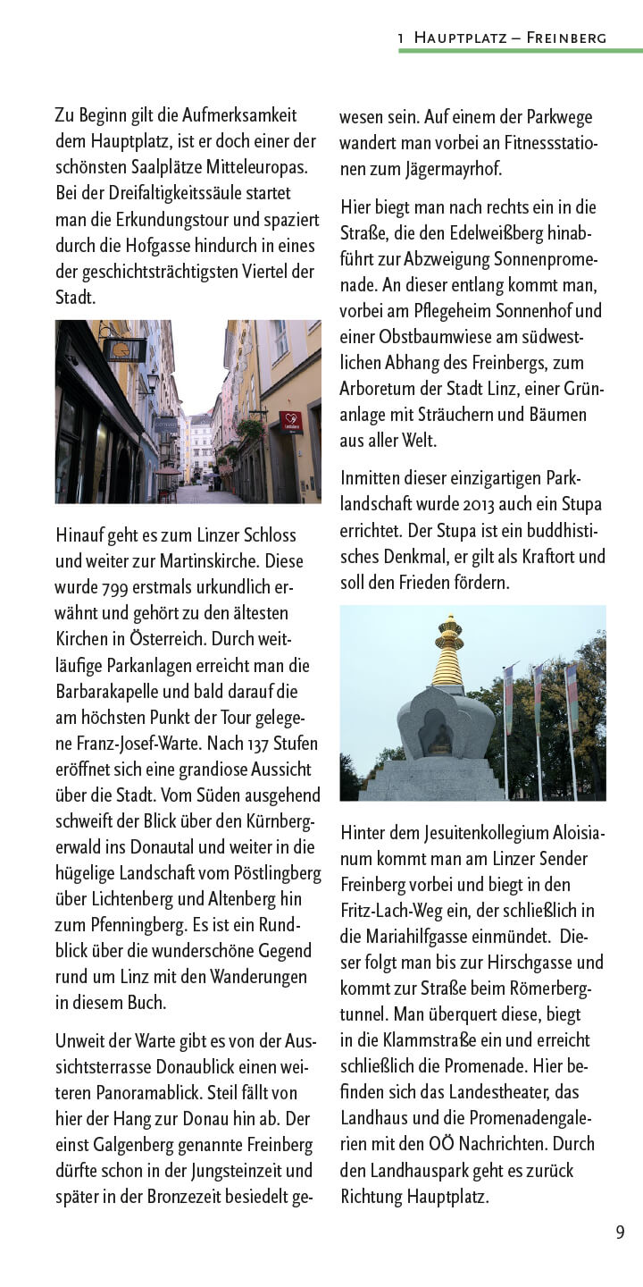 Wanderungen und Spaziergänge im Buch: Hauptplatz (Freinberg), Hauptplatz (Donau/Hafenrunde), Stadtoasen (Linzer Parks), Gaumberg (Türmeweg), Domplatz (Wasserwald), Ebelsberg (Weikerlseen), Pichlinger See (Ebelsberg), Ebelsberg (Traunuferweg), Schloss Traun (Oedter See), Ansfelden (Sinfoniewanderweg & Brucknerweg), Rufling (Kürnbergwanderung), Wilhering (Bauern- und Holzknechtrunde), Wilhering (Donausteig nach Linz), Rottenegg (Rodltalrunde), Gramastetten (Donaublick), Ottensheim (Kraftwerksrunde), Lichtenberg (Höhenwanderung), Kirchschlag (Eidenberg & Gis), Kirchschlag (Stifterwanderweg), Eidenberg (Höhenweg), Urfahr (Wege zur Gis), Urfahr (Lichtenberg Höllmühlgraben), Harbach (Dießenleitentalrunde), Urfahr (Ottensheim), Puchenau (Kapellenhöhe), Linz-Domplatz (Kreuzwegrunde), Urfahr-Gründberg (Stadtwanderweg 7), Plesching (Donausteig nach Pulgarn), St. Magdalena (Silbergrabenrunde), Steyregg (Drei-Buchen-Weg), Luftenberg (Sagenweg), Altenberg (Mirellentalrunde), Gallneukirchen (Pferdeeisenbahnweg), Gusen (Gedenkweg), Über alle Berge (in 5 Etappen), Pöstlingberg, Abendwanderungen