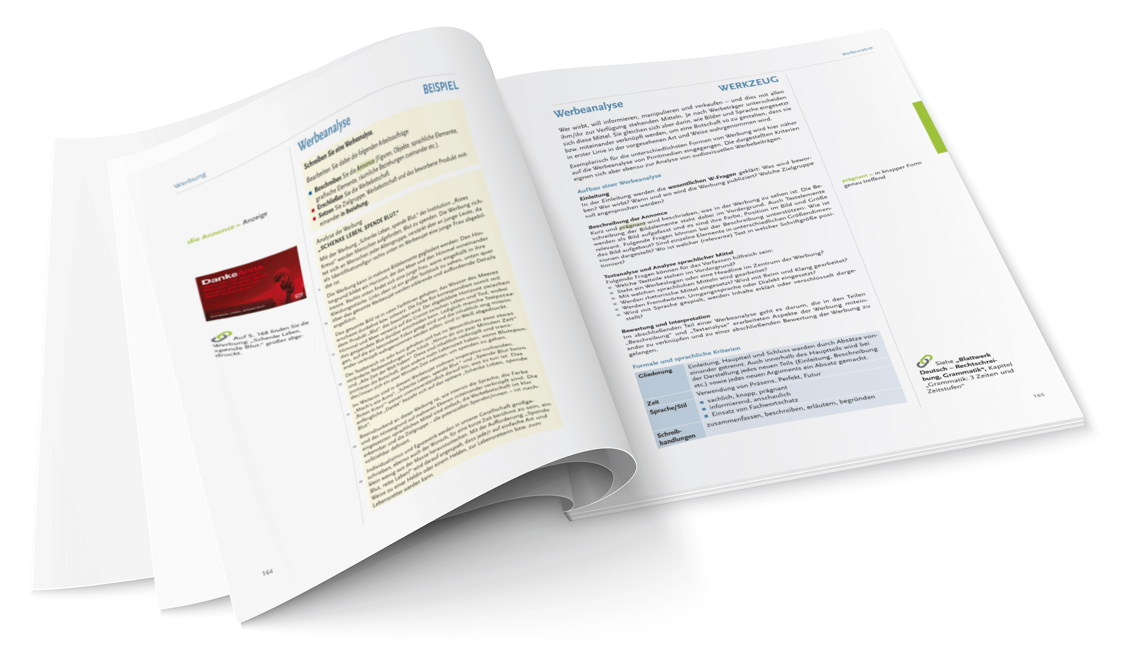 Für die Entwicklung des textsortengebundenen Schreibens wird auf BEISPIEL- und WERKZEUG-Seiten das nötige theoretische Wissen vermittelt. SPRACHWERKZEUGE unterstützen die Lernenden mit praktischen Formulierungshilfen. Die darauf folgenden Arbeitsaufgaben ermöglichen es, anhand zuvor gelernter Kriterien Schritt für Schritt jene Kompetenzen zu entwickeln, die für eine gelungene Textproduktion erforderlich sind.