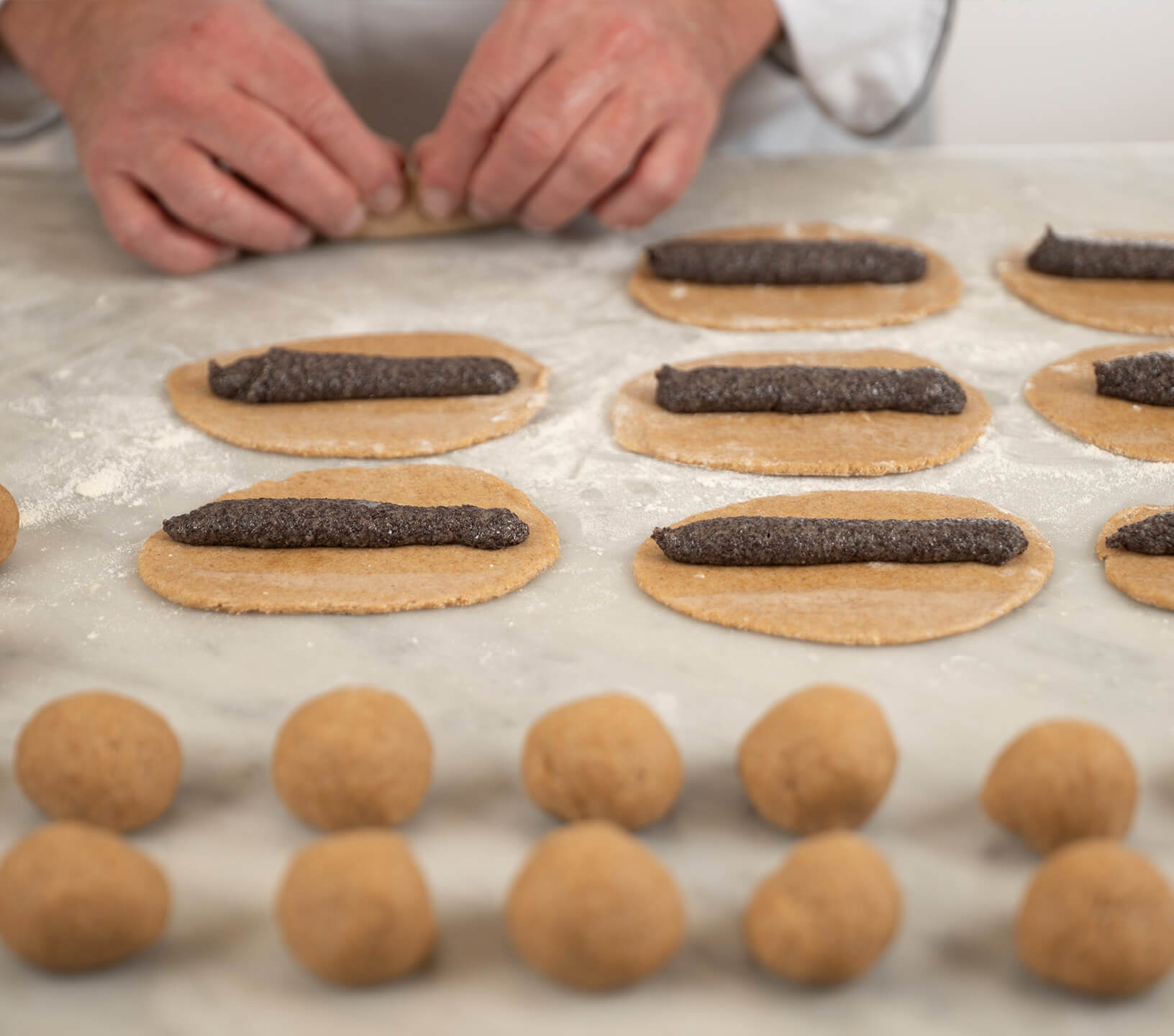 - Teigstücke oval ca. 2–3 mm dünn ausrollen. Mohn- bzw. Nussfüllung der Länge nach in der Mitte aufdressieren. Straff zigarrenförmig einrollen und zu länglichen oder spitzen Kipferln (Hörnchen) formen.