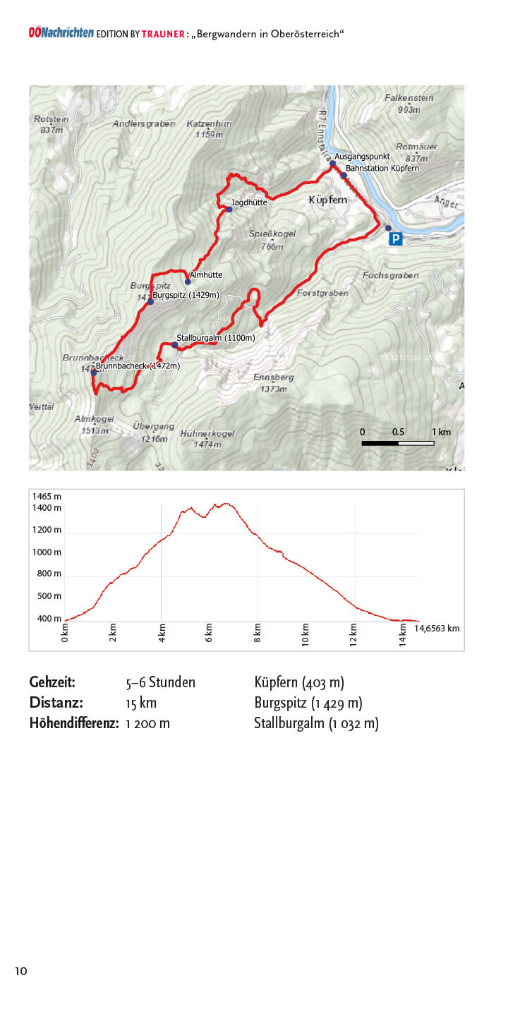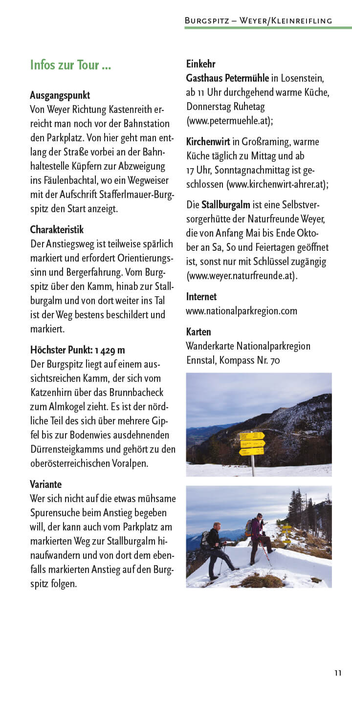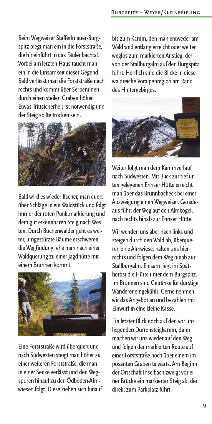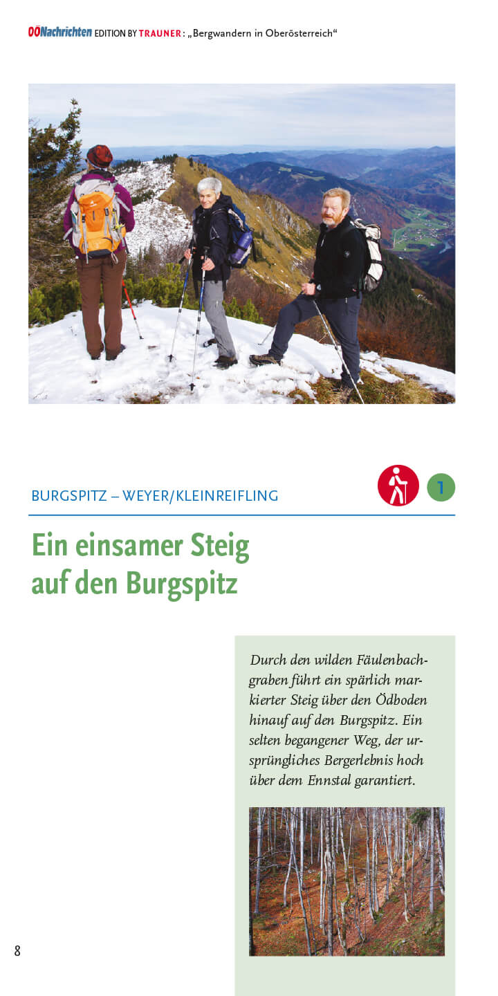 Touren im Wanderführer: Burgspitz (Weyer/Kleinreifling), Trämpl und Alpstein (Molln), Scheiblingstein (Rosenau), Kleiner Pyhrgas (Spital am Pyhrn), Großer Pyhrgas (Spital am Pyhrn), Bosruck (Spital am Pyhrn), Mayrwipfl und Brandleck (Windischgarsten), Schoberstein (Trattenbach), Dürres Eck und Gaisberg (Molln), Rohrauer Größtenberg (St. Pankraz), Tamberg (Vorderstoder), Rote Wand und Dümlerhütte (Spital am Pyhrn), Warscheneck Südost (Spital am Pyhrn), Schrocken und Hochmölbing (Hinterstoder), Kleine Scheibe (Hinterstoder), Dolomitensteig (Hinterstoder), Kremsmauer (Micheldorf), Großer Priel (Hinterstoder), Windhagkogel (Grünau), Hochsalm und Maisenkögerl (Scharnstein), Pühringerhütte und Appelhaus (Grünau), Schönberg und Rinnerkogel (Ebensee), Loser-Umrundung (Altaussee), Hochglegt und Rettenbachalm (Bad Ischl), Gasslhöhle und Spitzelsteinalm (Ebensee), Traunstein (Gmunden), Richtberg und Hongar (Altmünster/Weyregg), Geißwand und Fahrnaugupf (Traunkirchen), Sonnstein-Überschreitung (Ebensee/Traunkirchen), Höllengebirgsüberschreitung (Ebensee), Schoberstein (Steinbach/Weißenbach), Dachsteinüberquerung (Obertraun), Nature Trail Dachstein (Obertraun), Gosaukamm (Gosau), Braunedlkogel (Strobl/Postalm), Wieslerhorn (Strobl/Postalm), Schafbergrunde (St. Wolfgang), Almkogel (St. Gilgen), Schober (Fuschl), Filbling (Fuschl)