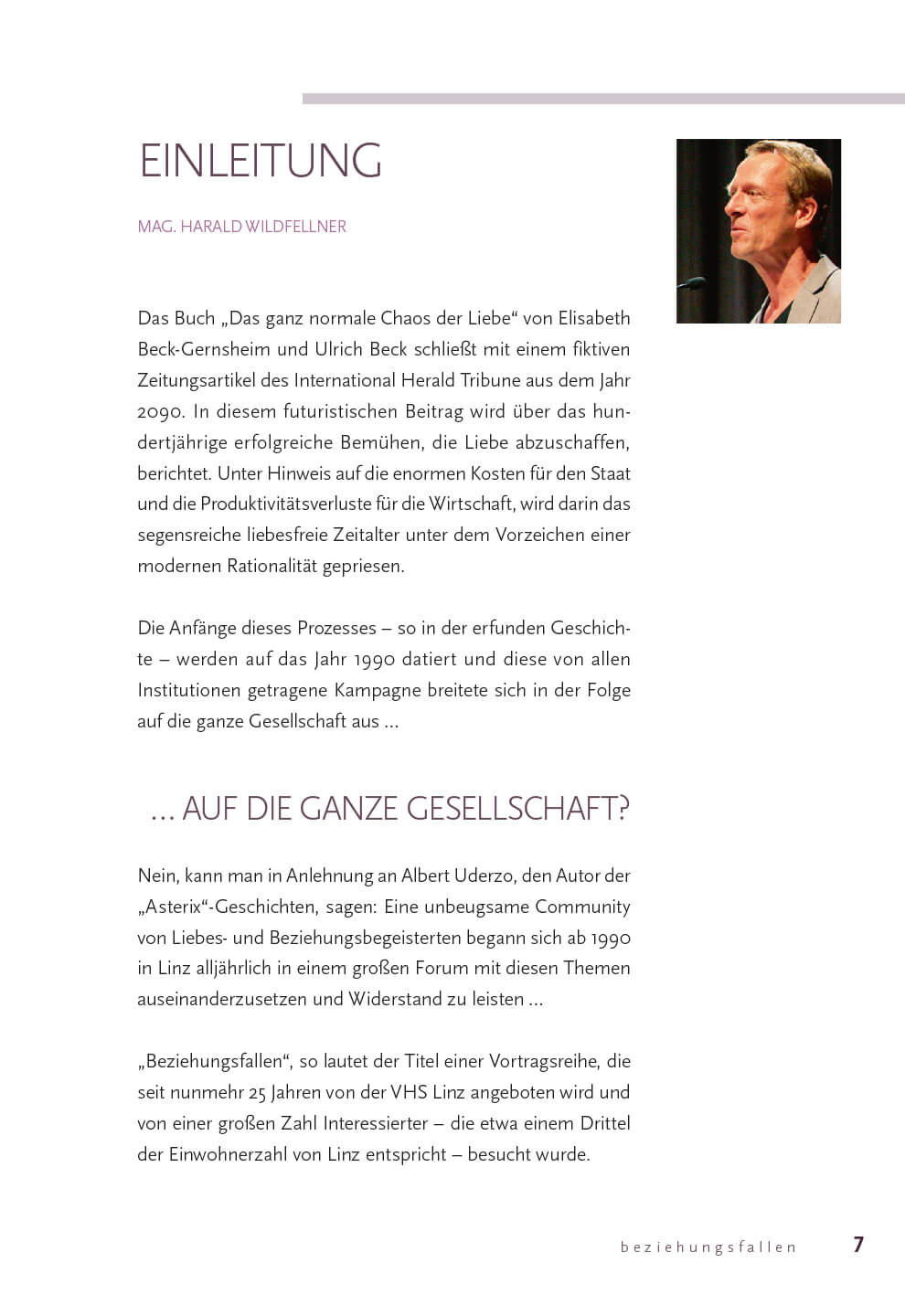 Die Vortragsreihe „Beziehungsfallen“ der Volkshochschule Linz ist die Veranstaltung, die seit Beste-hen dieser Erwachsenenbildungseinrichtung das meiste Interesse gefunden hat. Zigtausende Men-schen haben die bisher 115 Vorträge besucht und ein breites Spektrum über Beziehungsgestaltung und die damit verbundenen Beziehungsfallen gehört.