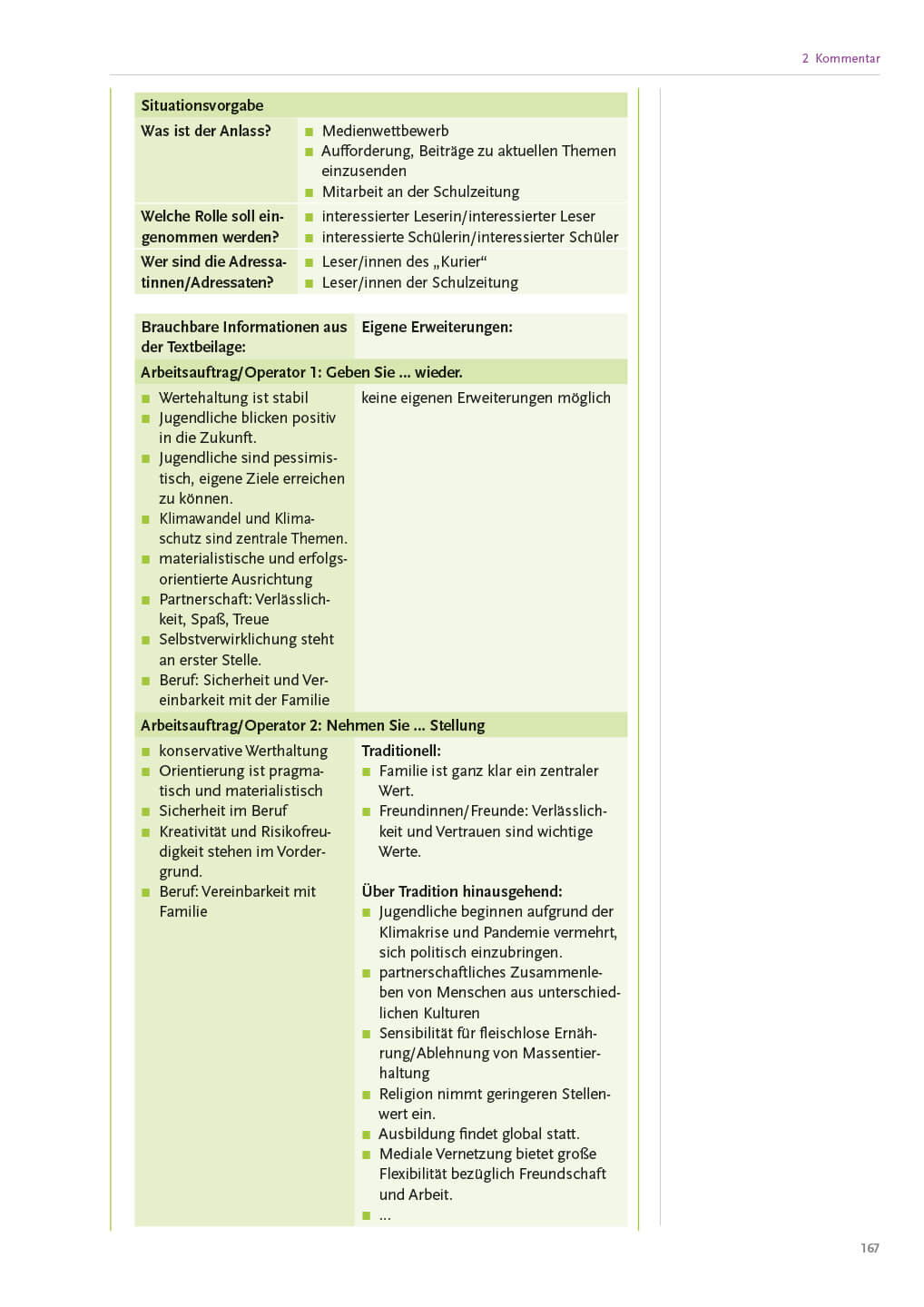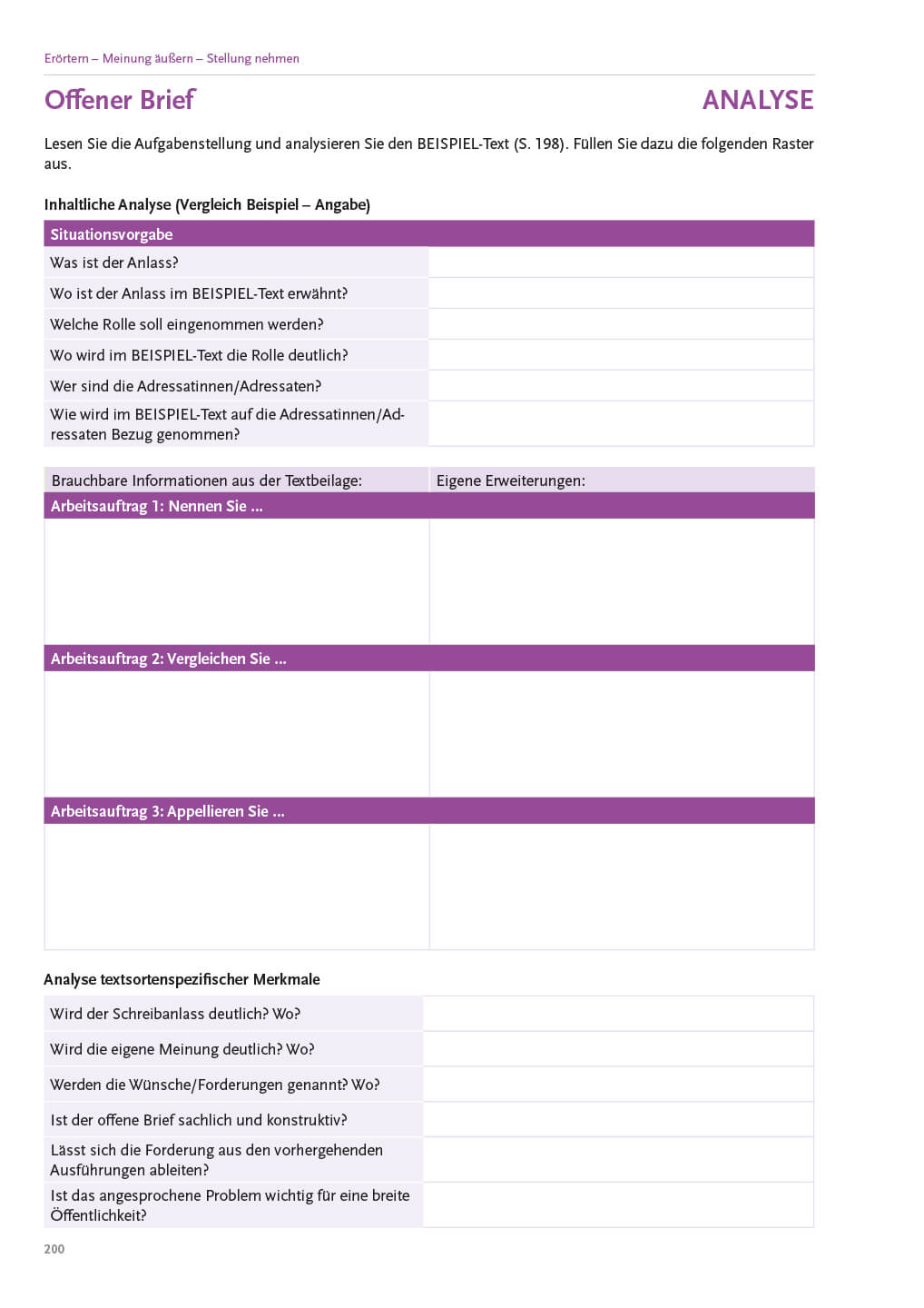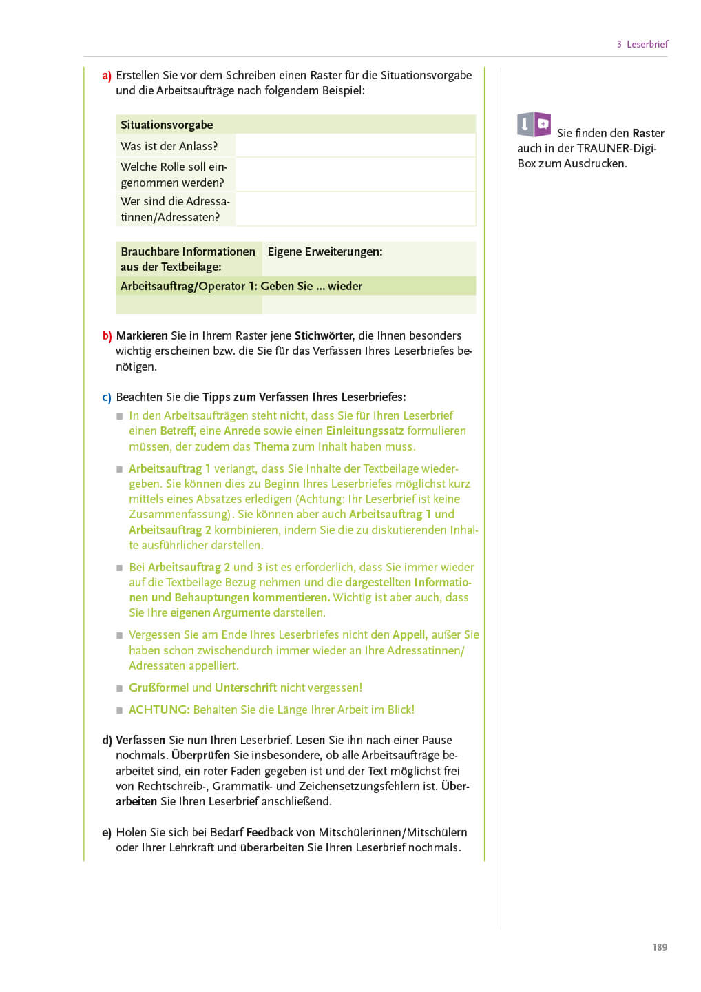 Für die Entwicklung des textsortengebundenen Schreibens wird auf BEISPIEL- und WERKZEUG-Seiten das nötige theoretische Wissen kompakt vermittelt. Die darauf folgenden Arbeitsaufgaben ermöglichen es den Schülerinnen und Schülern, anhand zuvor (kennen-)gelernter Kriterien Schritt für Schritt jene Kompetenzen zu entwickeln, die für eine gelungene Textproduktion erforderlich sind.