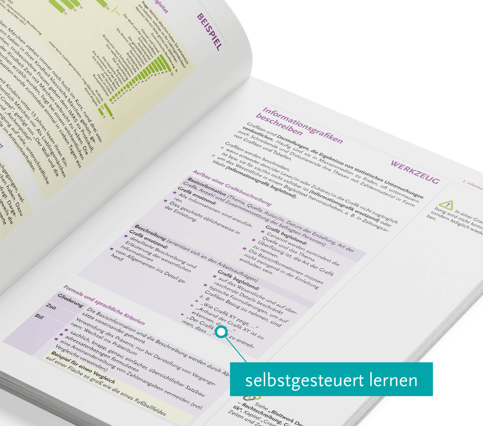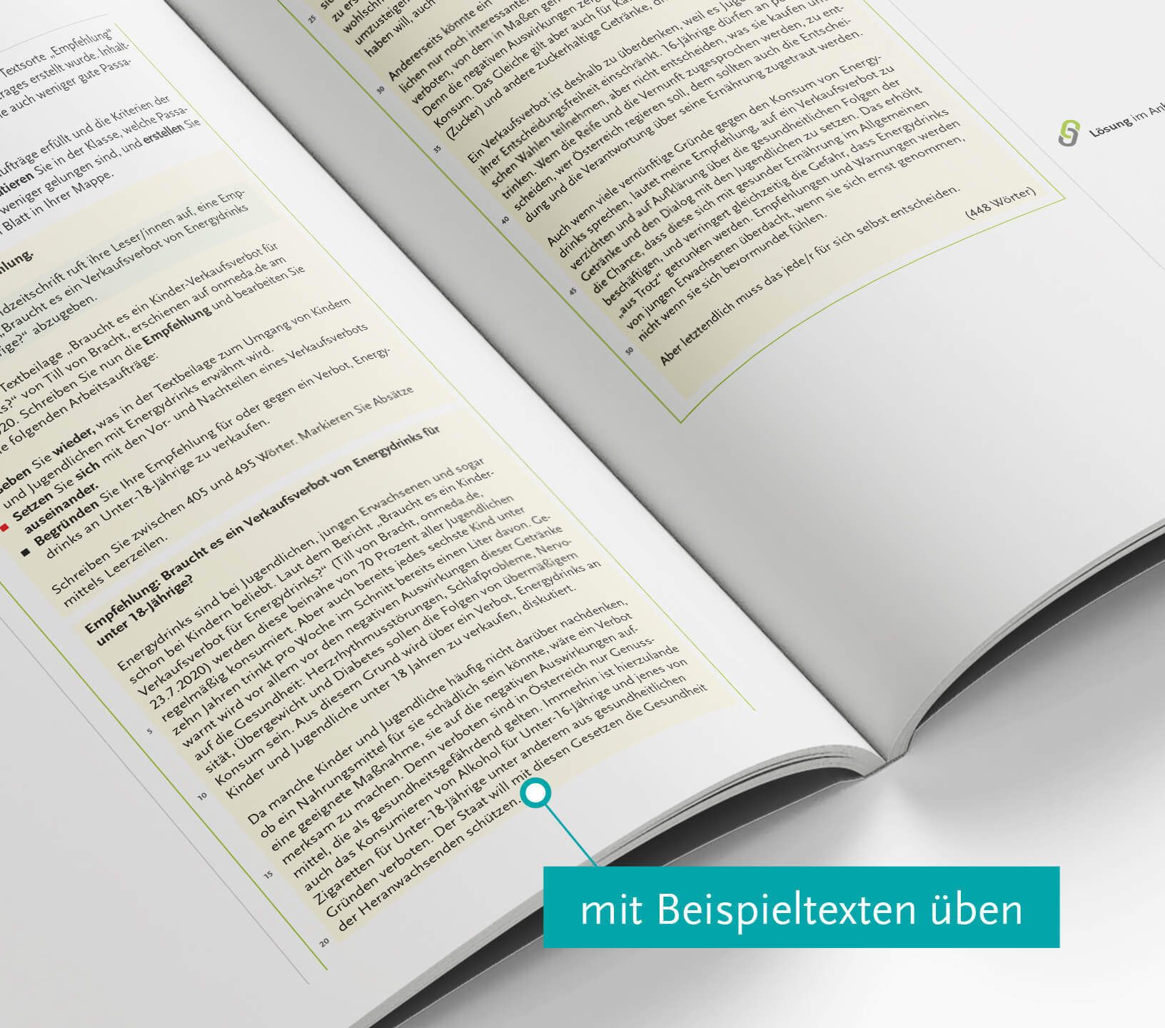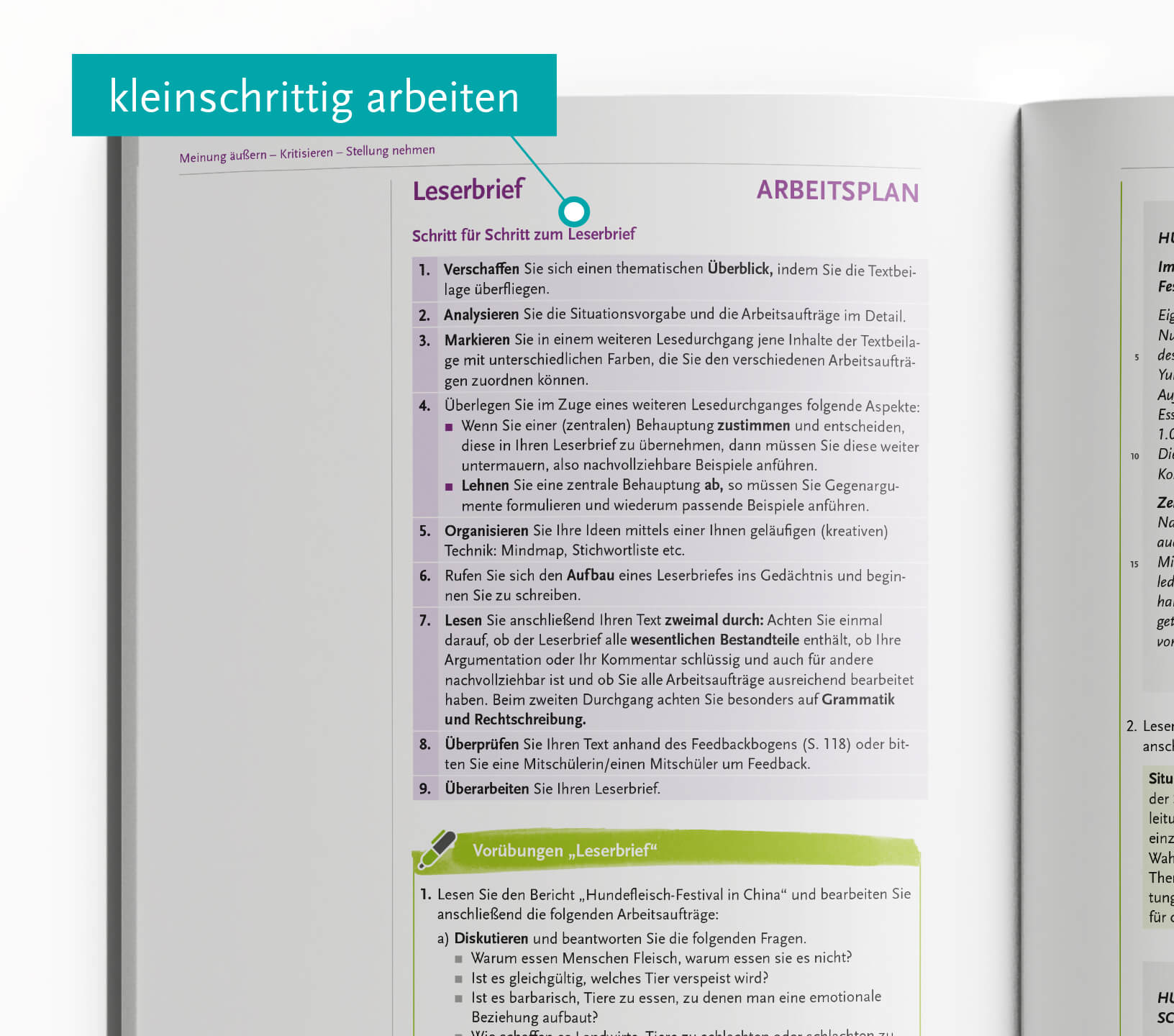 Für die Entwicklung des textsortengebundenen Schreibens wird auf BEISPIEL- und WERKZEUG-Seiten das nötige theoretische Wissen kompakt vermittelt. Die darauf folgenden Arbeitsaufgaben ermöglichen es den Schülerinnen und Schülern, anhand zuvor (kennen-)gelernter Kriterien Schritt für Schritt jene Kompetenzen zu entwickeln, die für eine gelungene Textproduktion erforderlich sind.