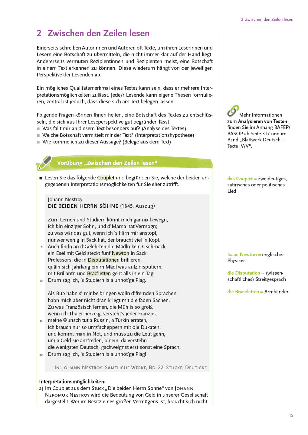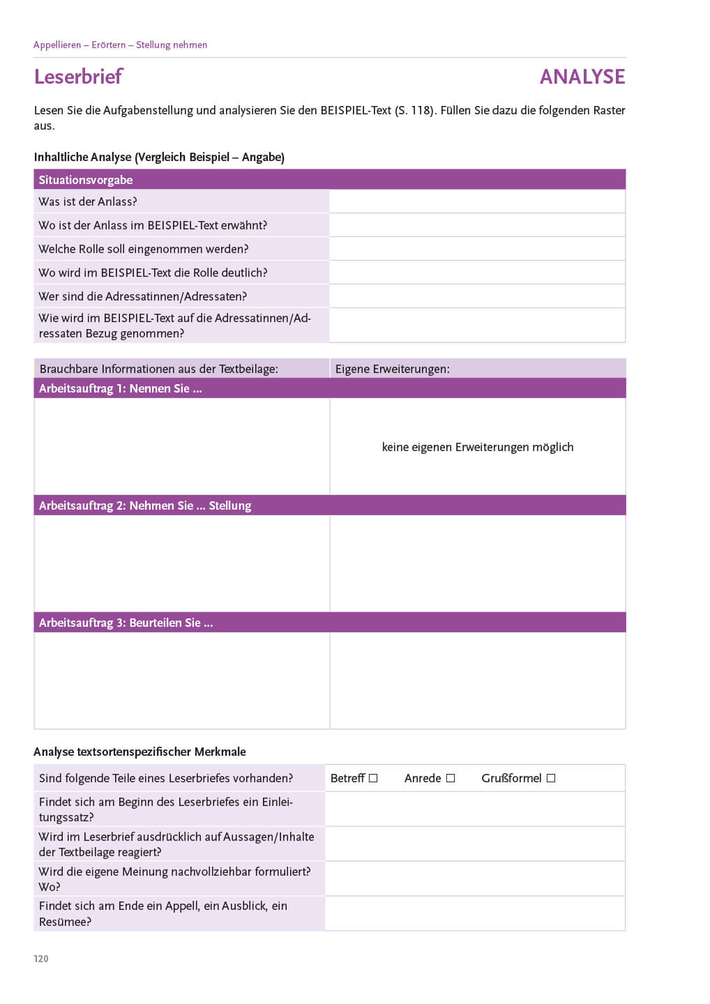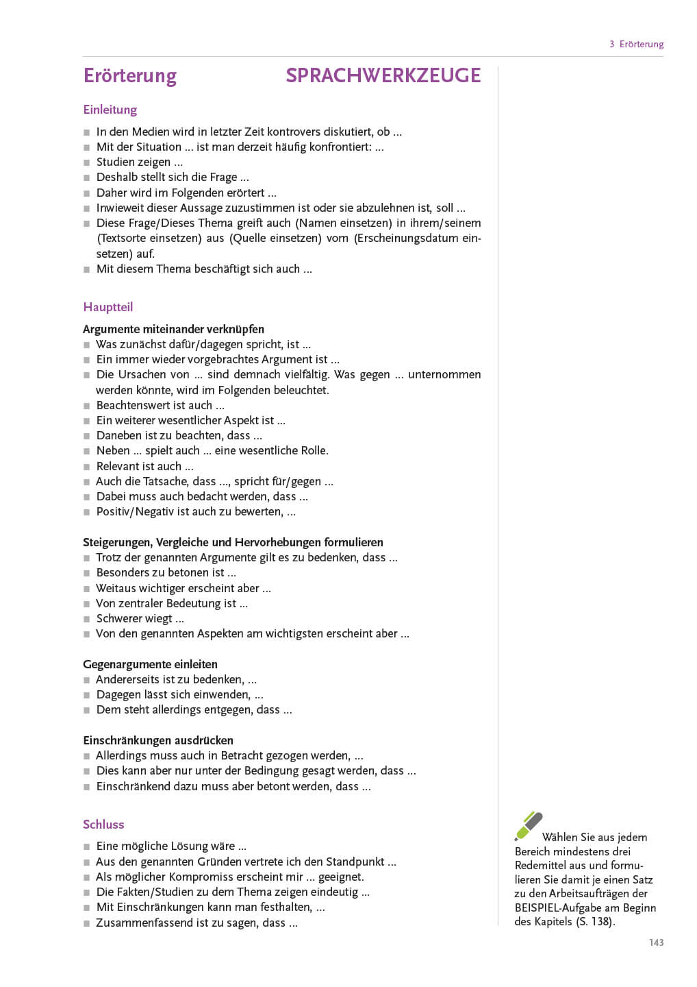 Für die Entwicklung des textsortengebundenen Schreibens wird auf BEISPIEL- und WERKZEUG-Seiten das nötige theoretische Wissen kompakt vermittelt. Die darauf folgenden Arbeitsaufgaben ermöglichen es den Schülerinnen und Schülern, anhand zuvor (kennen-)gelernter Kriterien Schritt für Schritt jene Kompetenzen zu entwickeln, die für eine gelungene Textproduktion erforderlich sind.