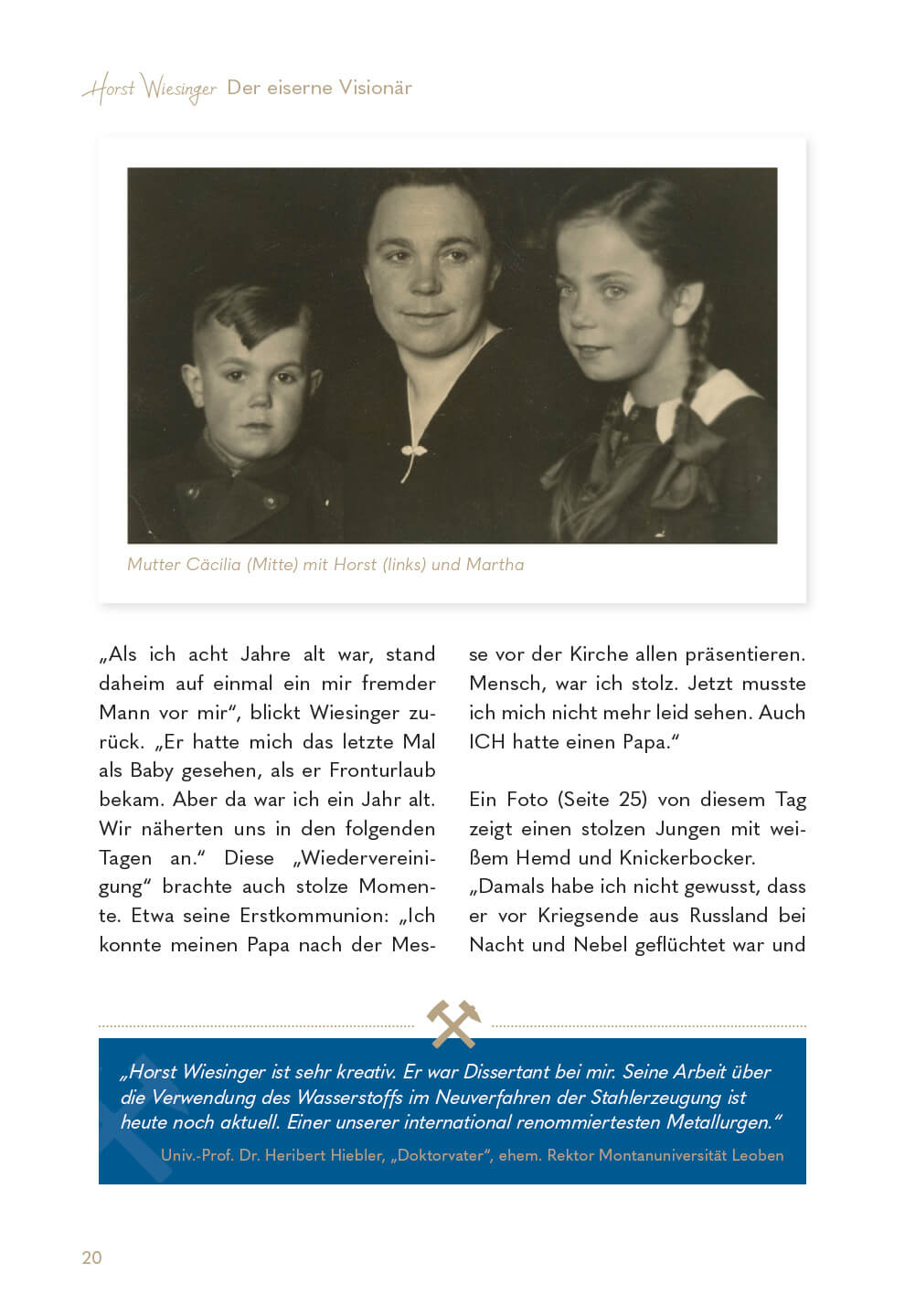 Dr. Horst Wiesinger, viele Jahre lang führendes Mitglied des VÖEST-Imperiums und mit 85 Jahren immer noch aktiv als Geschäftsführer seiner eigenen Firma, gibt in dieser Biografie Antworten. Ein entscheidender Faktor dabei ist der Stahlverbrauch pro Person. Zudem gewährt Horst Wiesinger Einblicke in seine Kindheit in Eferding und seinen beeindruckenden Werdegang. Schon als Junge sammelte er Schrott, verdiente damit manchmal ebenso viel wie ein Arbeiter und entwickelte eine besondere Verbindung zu Stahl. Heute sagt er: „Der Schrott ist das neue Gold der Zukunft!“ Seine Aussagen untermauert er mit Fakten, Daten und Diagrammen. In dieser Branche hat Horst Wiesingers Wort nach wie vor großen Einfluss.