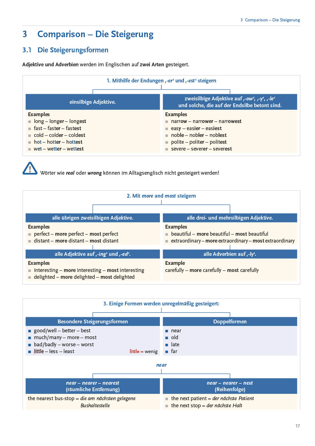 Die einzelnen Grammatikkapitel sind alphabetisch geordnet. Jedes Kapitel enthält zahlreiche Übungssätze sowie mindestens eine Übung „Grammar in Context“, für die ein Text auf dem Niveau B2 herangezogen wird. Zusätzlich bietet der Band Erklärungen und Regeln in übersichtlicher Form zum Nachschlagen an.