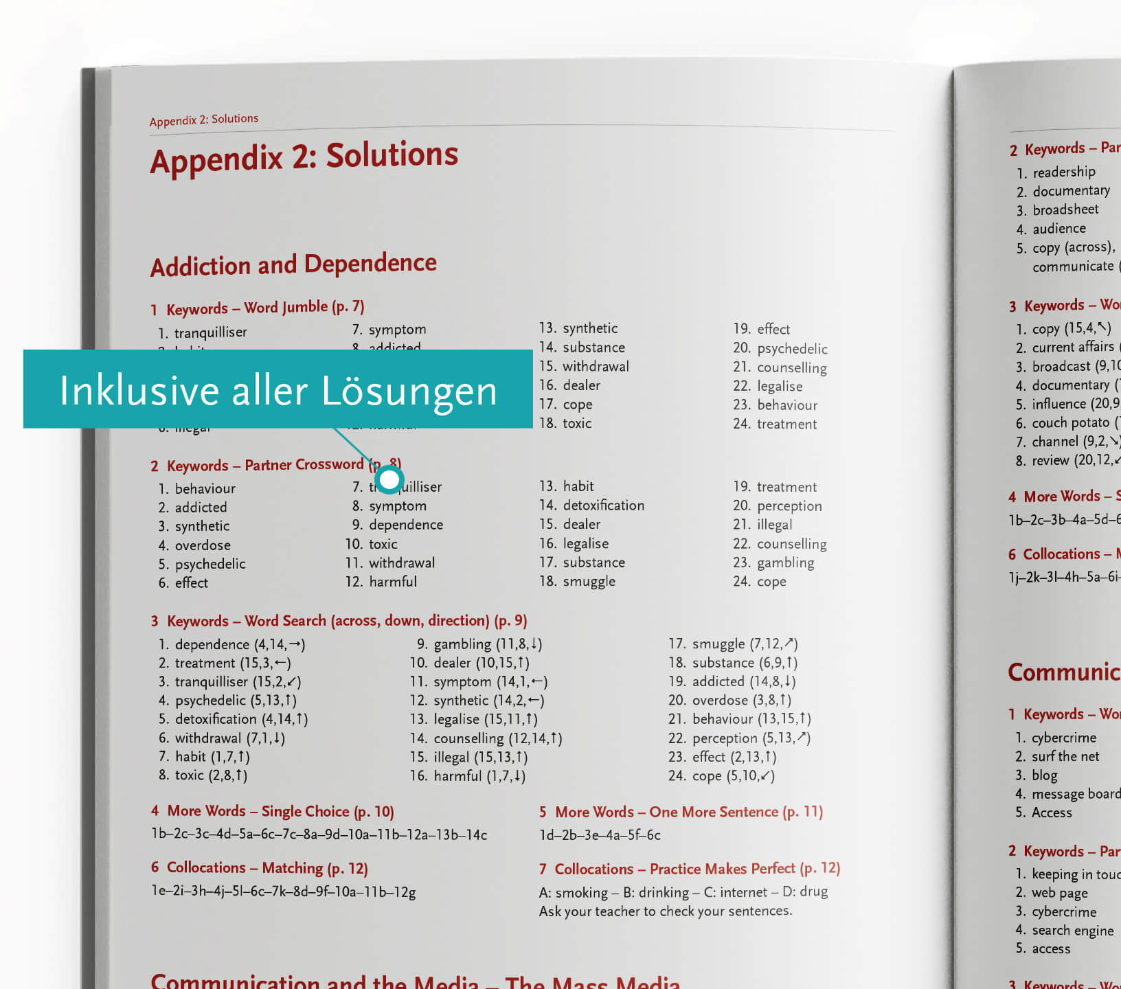 Das digitale Zusatzpaket enthält nicht nur das E-Book, sondern bietet Ihnen außerdem die Möglichkeit, die Vokabel auch ganz bequem unterwegs am Smartphone oder Tablet zu üben. Sie finden alle Keywords als Lernkarteien, zahlreiche Memorys, zusätzliche Übungen zum erweiterten Vokabular und sämtliche Crosswords mit allen Angaben zum Ausdrucken. So kann der Wortschatz themenbezogen gezielt erweitert und auf Maturaniveau gebracht werden.