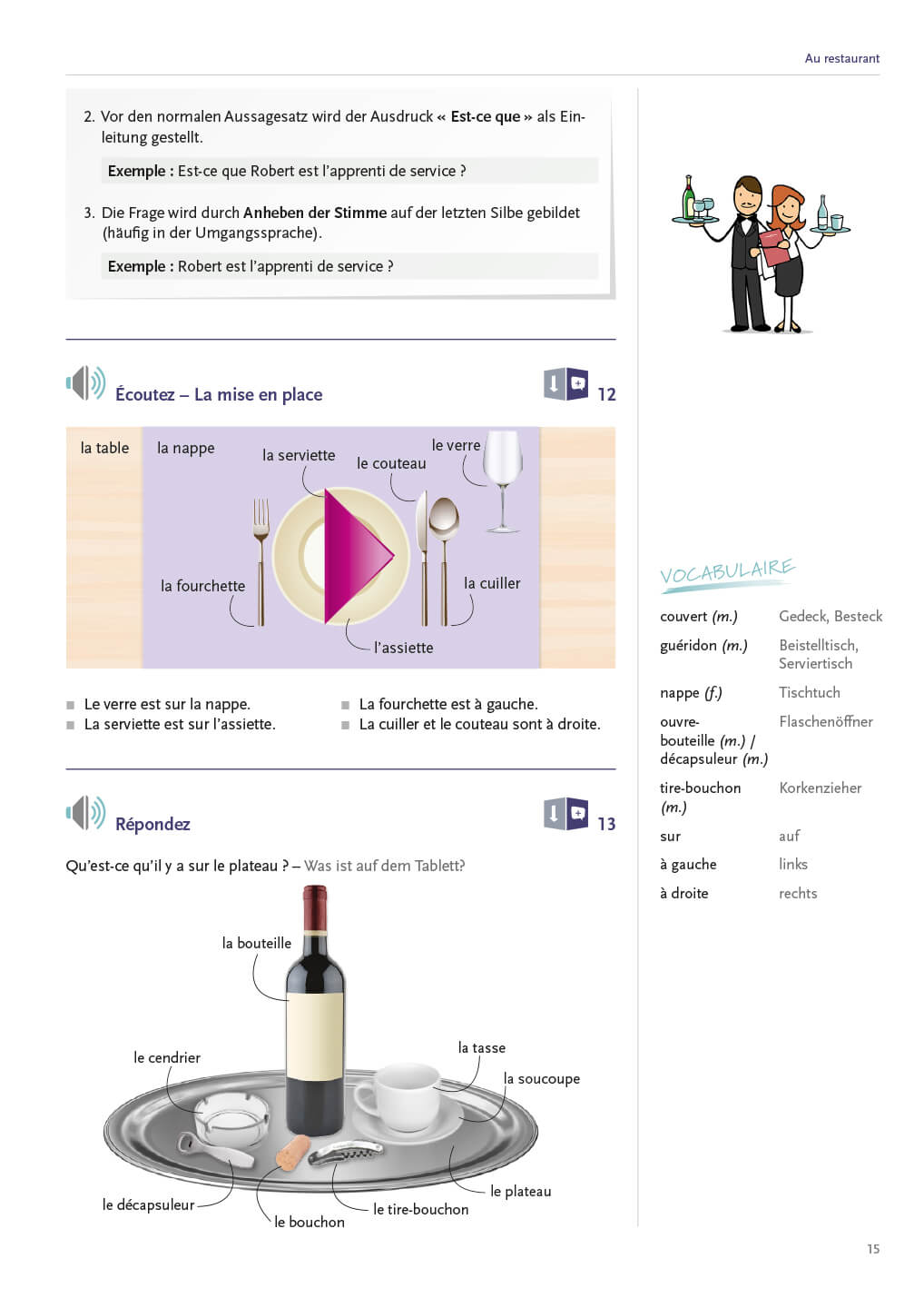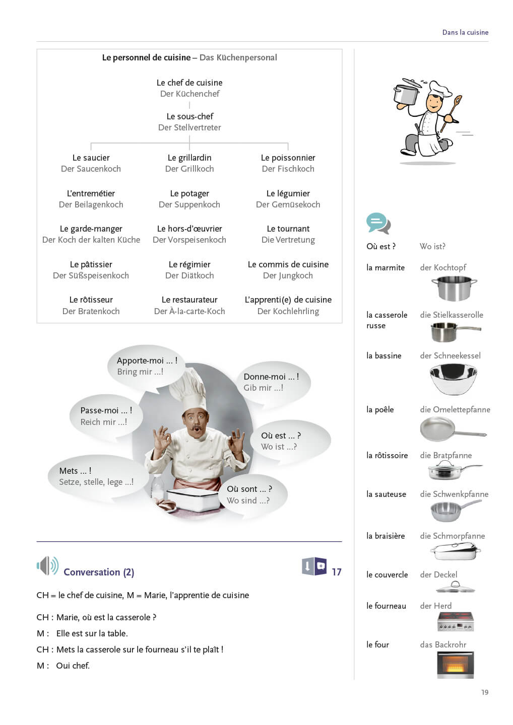 - Appendix (la prononciation, grammaire, phrases, vocabulaire gastronomique, les traductions des cartes, cartes, menus, vocabulaire des recettes, recettes, littérature, vocabulaire)