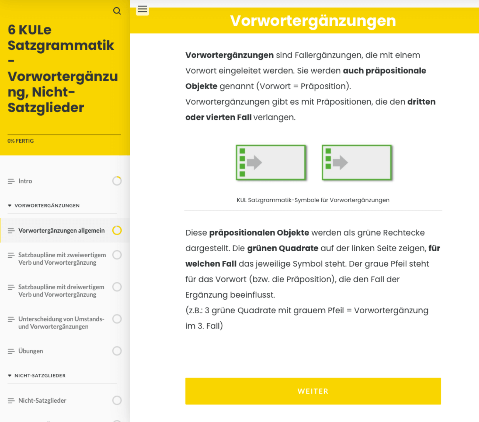 Lerne Vorwortergänzungen kennen, erfahre, wie man diese einführt sowie übt und wie man sie von Umstandsergänzungen unterscheidet. Lerne, was Nicht-Satzglieder sind und wie man damit umgeht. Lernen anhand von konkreten Beispielen, wie das Konzept in der Praxis umgesetzt werden kann. Vertiefe und erweitere dein eigenes Grammatikwissen anhand von Beispielen, um in der Praxis flexibel agieren zu können.