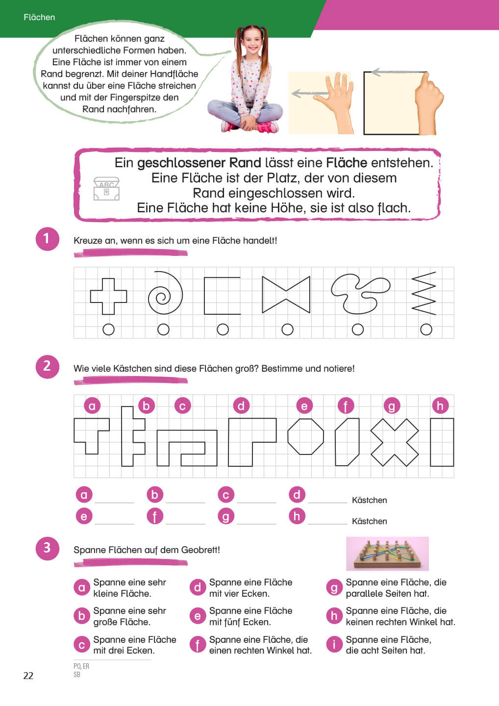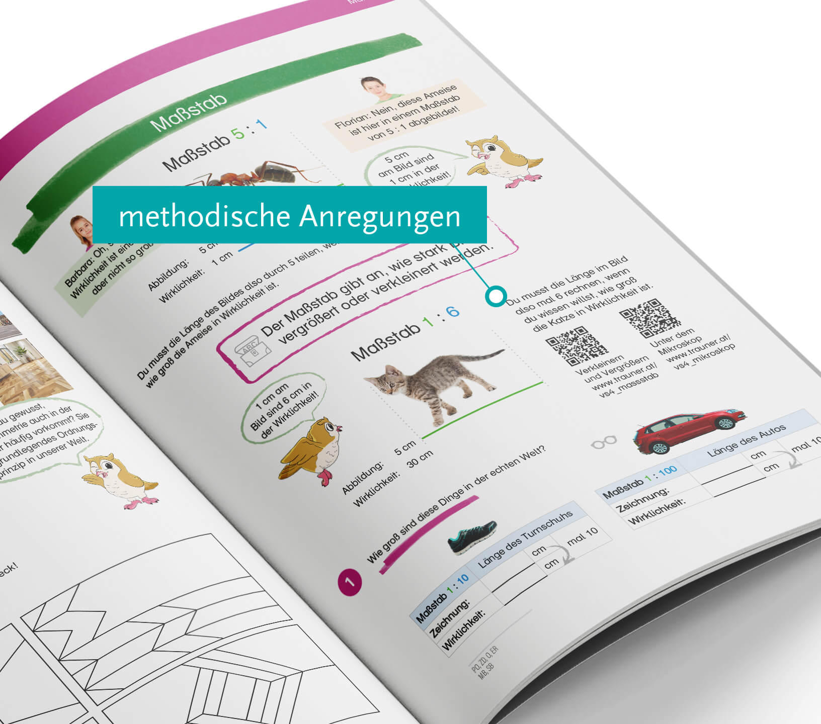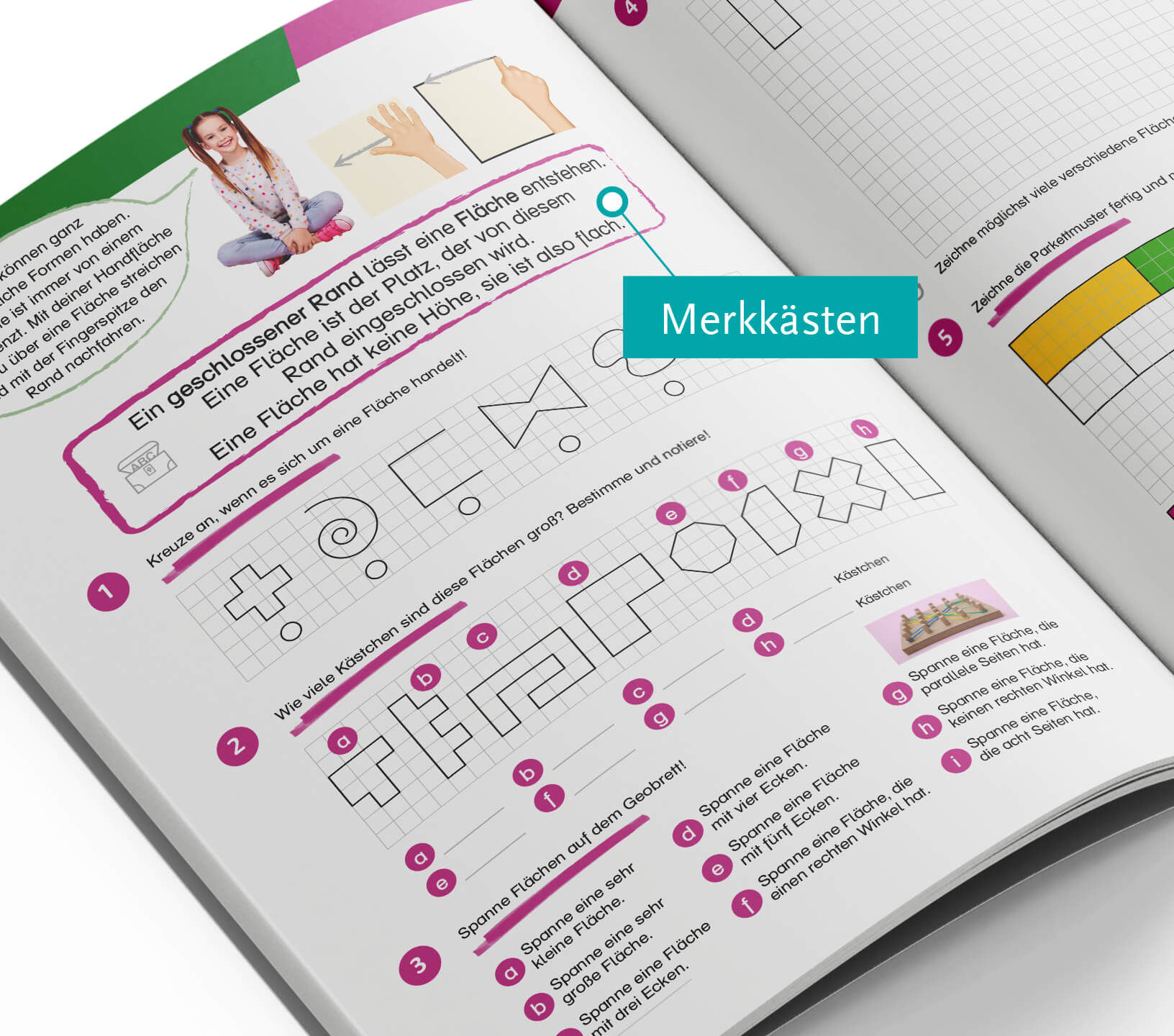 Die Schüler/innen lernen Muster, Formen, den rechten Winkel, den Umfang und vieles mehr kennen. Anschauliche Beispiele helfen dabei.