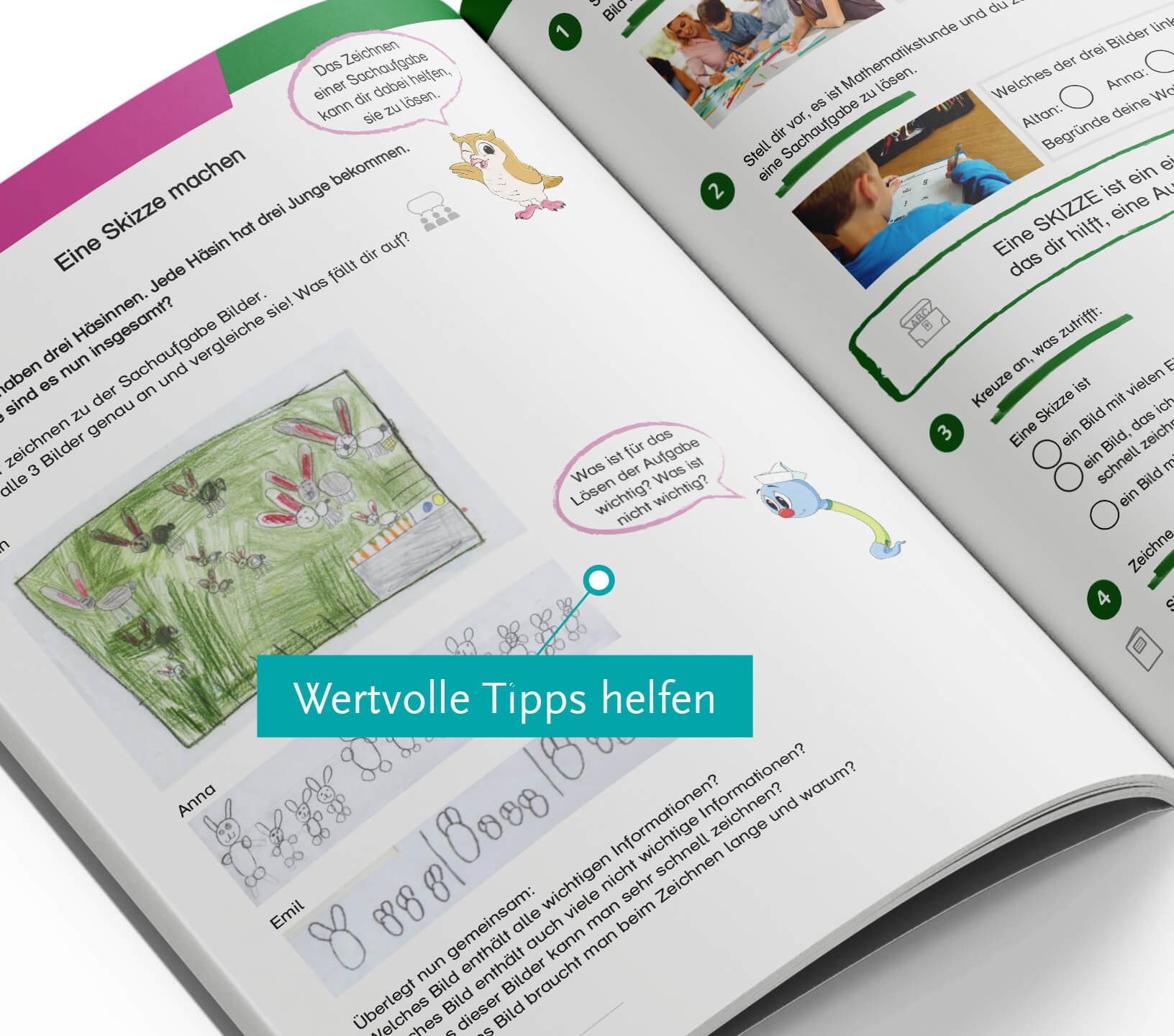 Alltagssituationen werden zu mathematischen Geschichten. Skizzen helfen beim Lösen der Aufgaben.