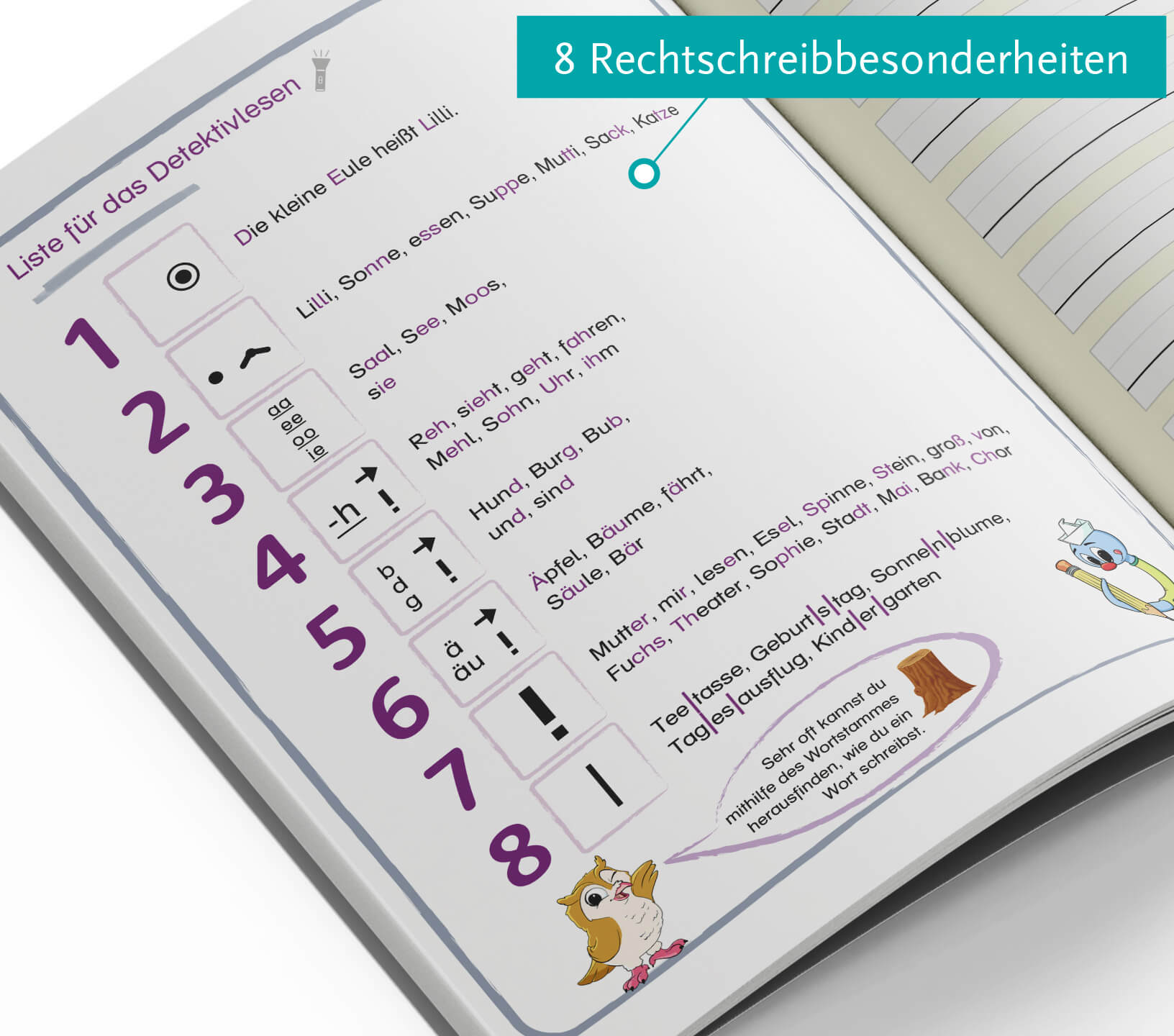 Dieses Registerheft ist nach den 8 Rechtschreibbesonderheiten unterteilt. Es dient zum Eintragen der Merkwörter und der Wörter mit Rechtschreibbesonderheiten. Das Arbeitsheft begleitet die Schüler/innen durch die 1. Grundstufe.