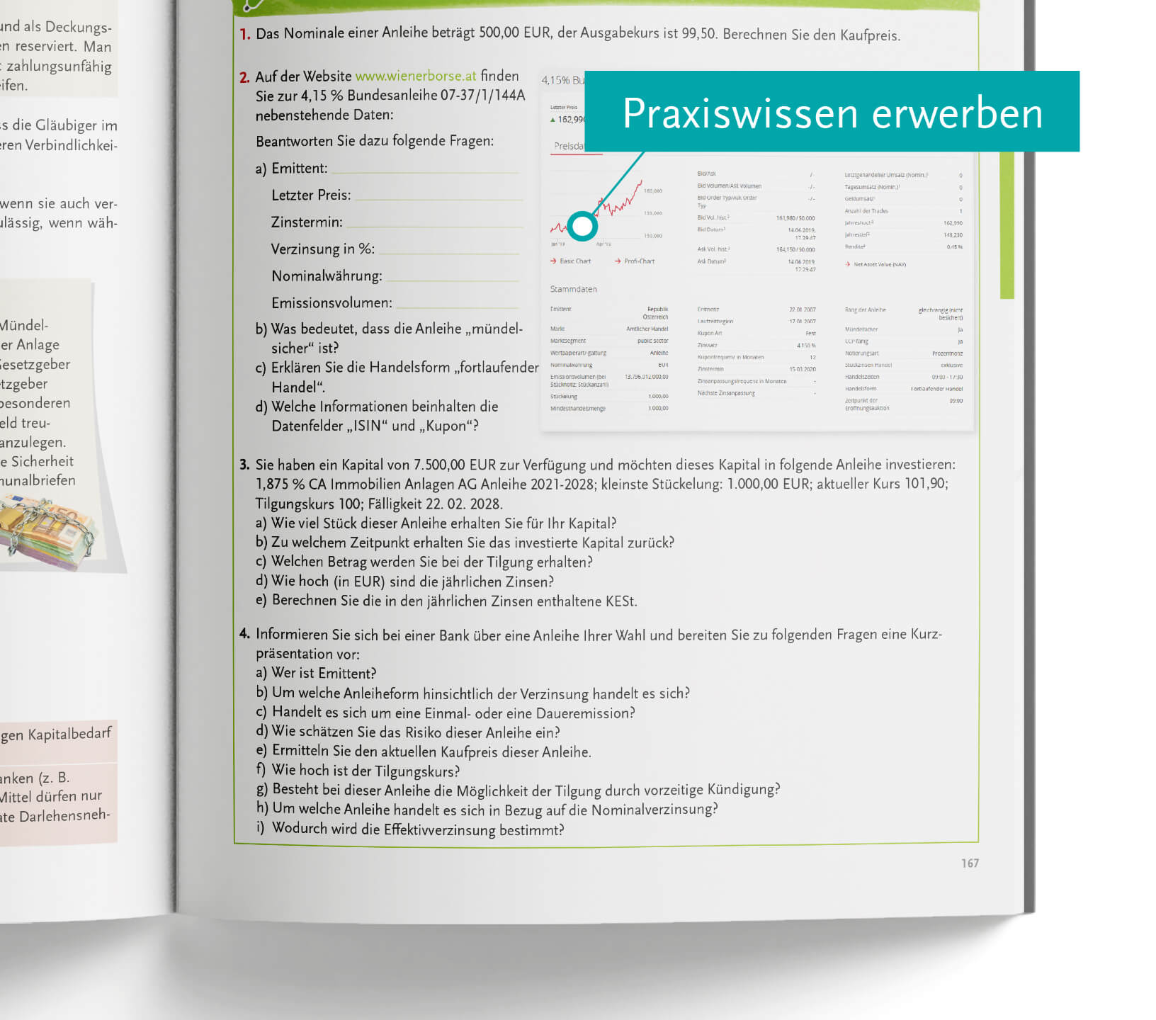 Wir holen für Sie die Praxis ins Klassenzimmer! Welche verschiedenen Anlageformen gibt es am Kapitalmarkt? Mit welchen Tools können Unternehmen ihr Investitionsvorhaben wirtschaftlich beurteilen? Welche besonderen Risiken haben internationale Geschäfte? Diese und viele weitere Themen werden anhand spannender Praxisfälle realer Unternehmen behandelt. Die Schüler/innen erhalten dabei tiefe Einblicke in das Innenleben verschiedener Unternehmen und Branchen.