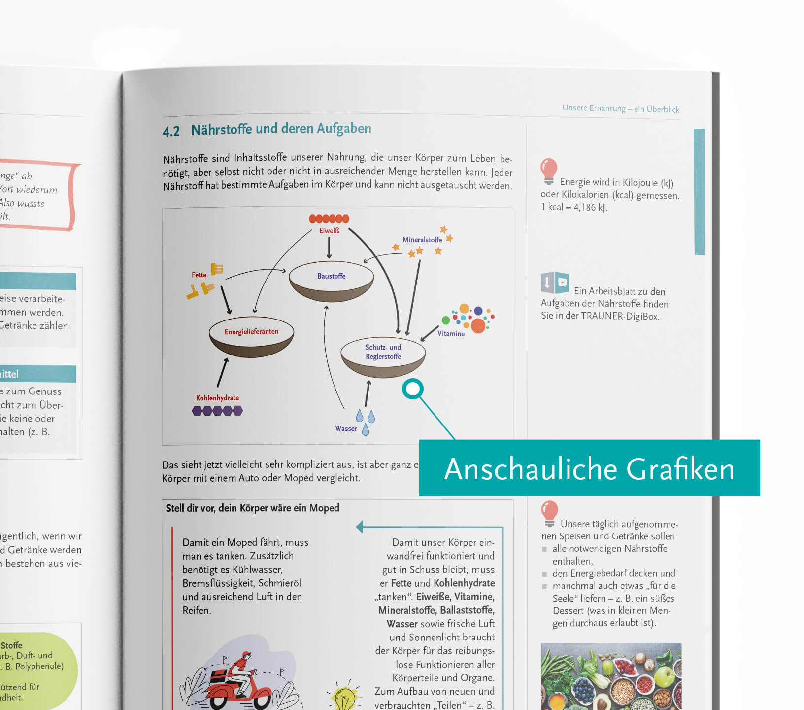 Im Kapitel „Lebensmittel“ geht es darum, den Schülerinnen und Schülern vor Augen zu führen, mit welchem Wert vom Einkauf über die Lagerung bis hin zur Vorbereitung und Verarbeitung tagtäglich gearbeitet wird. Woran erkennt man, ob die Ware frisch ist? Wie muss sie gelagert werden, damit sie nicht an Qualität einbüßt? Was muss bei der Vorbereitung beachtet werden? All diese Fragen werden abwechslungsreich und spannend beantwortet.