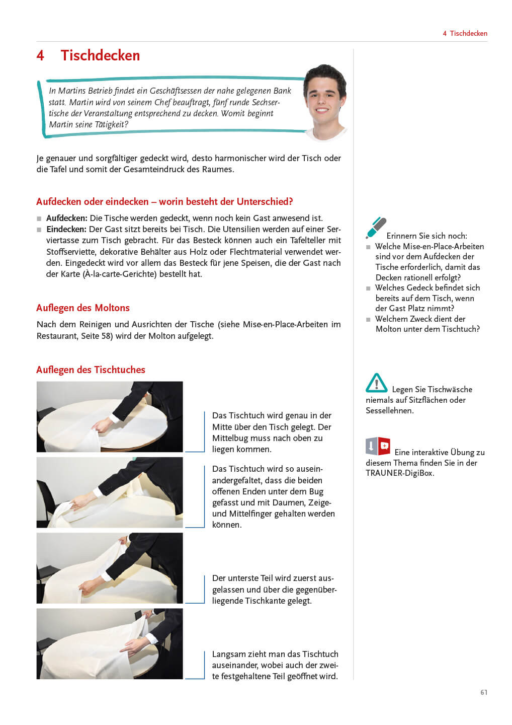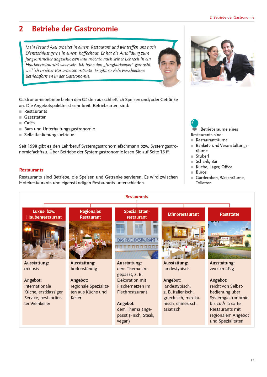 „Wir wollen unsere Gäste begeistern!“ Ein ansprechendes Berufsoutfit, ein sorgfältig gedeckter Tisch sowie ein korrektes Speisen- und Getränkeservice zählen zu den Grundlagen einer Restaurantfachfrau/eines Restaurantfachmannes. Alles, was darüber hinausgeht, macht das Service perfekt und trägt zum Erfolg der Servicemitarbeiter/innen bei.