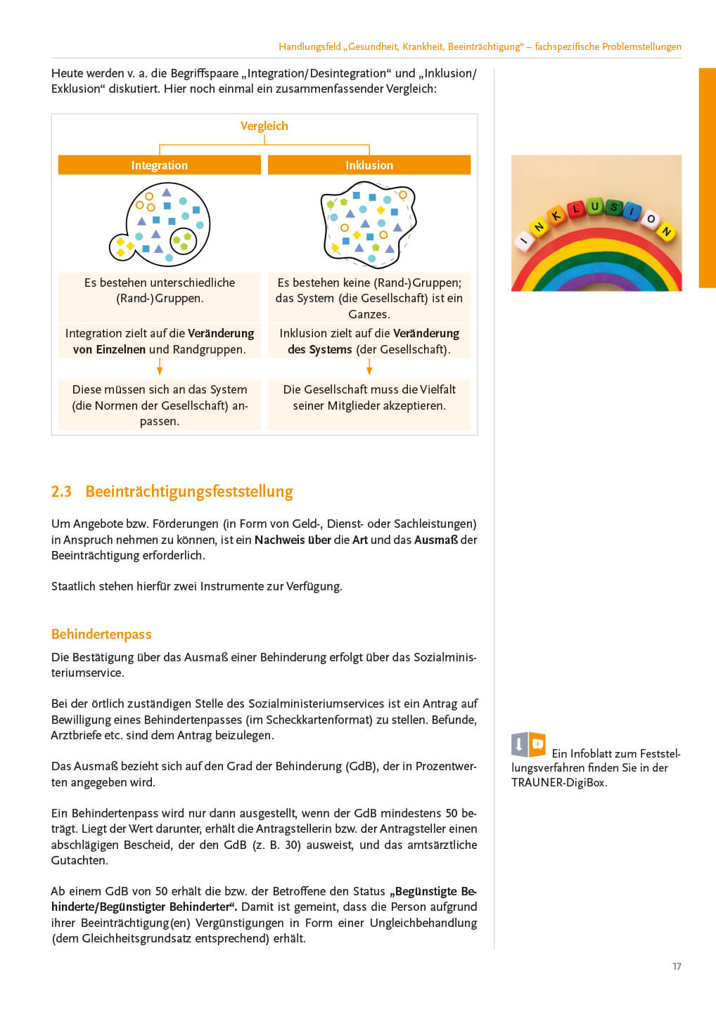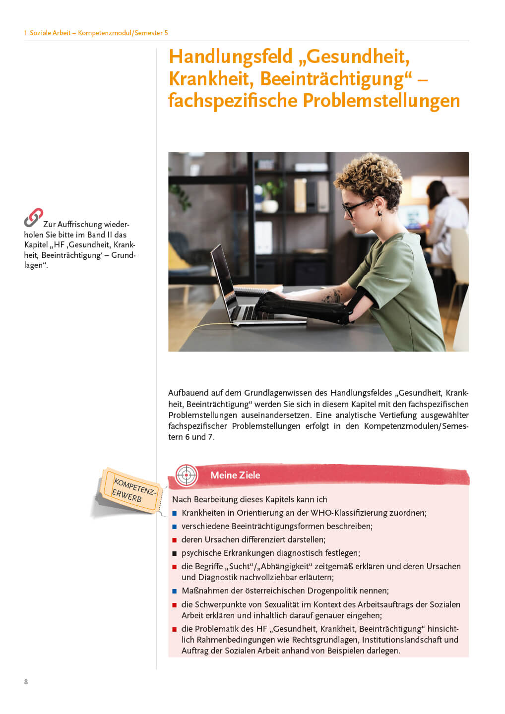 - Soziale Arbeit: HF „Gesundheit, Krankheit, Beeinträchtigung“ – fachspezifische Problemstellungen; Ziele, Aufgaben und Methoden der Sozialen Arbeit – Grundlagen; Die helfende Beziehung – Grundlagen