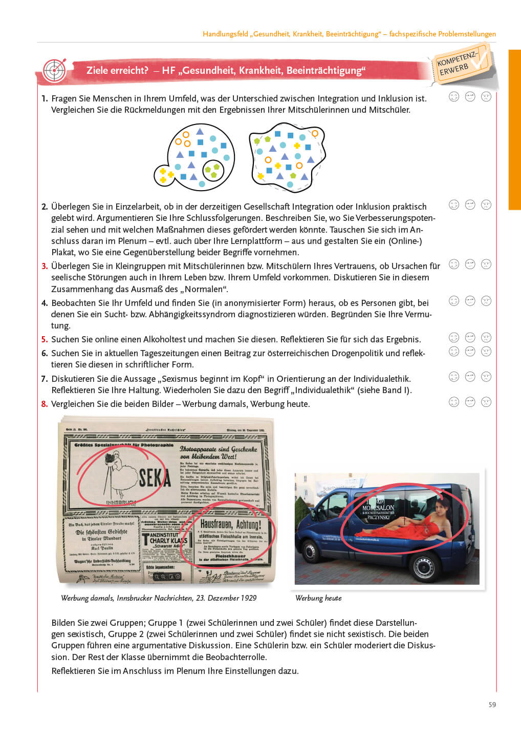 - Soziale Arbeit: HF „Gesundheit, Krankheit, Beeinträchtigung“ – Analyse fachspezifischer Problemstellungen; HF „(materielle) Grundsicherung“ – Grundlagen; Ziele, Aufgaben und Methoden der Sozialen Arbeit – praktische Anwendung