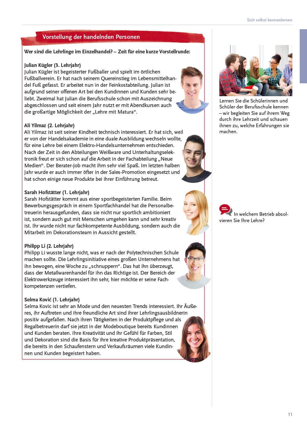 - Persönliche und berufliche Anforderungen (Sich selbst kennenlernen; Ich organisiere mich selbst; Eigenverantwortung, Werte und Arbeitshaltung; Umgangsformen - Business Behaviour; Konfliktmanagement; Umgang mit Produkten und Betriebsmitteln)