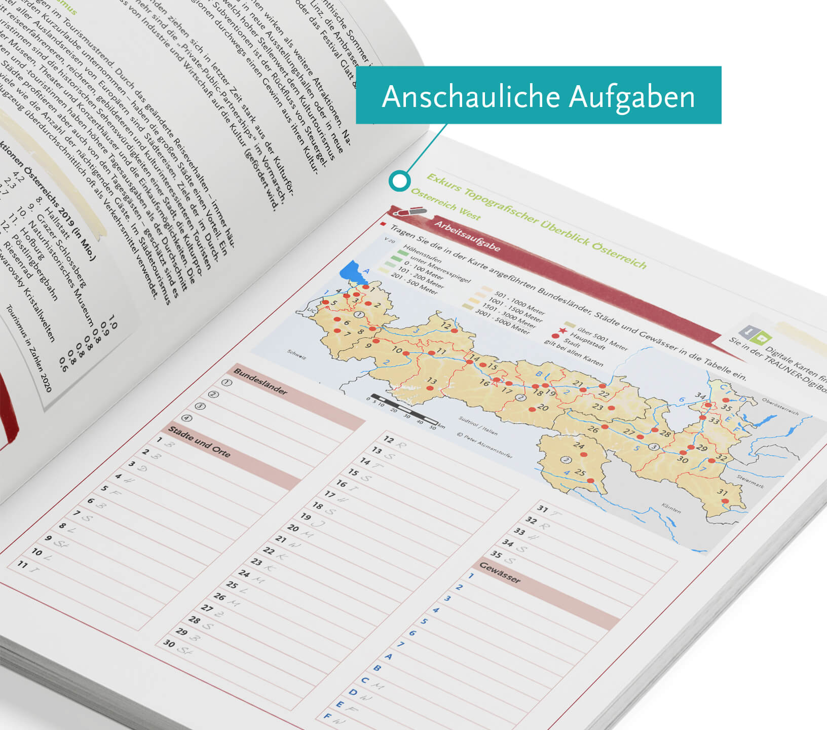 Räumliche Gegebenheiten werden in zahlreichen Karten dargestellt. Damit können die Schüler/innen ihr topografisches Grundwissen festigen und vertiefen. Ziel ist es, Ursachen und Folgen menschlichen Handelns darzustellen, Zusammenhänge zu begreifen – die Welt zu verstehen.